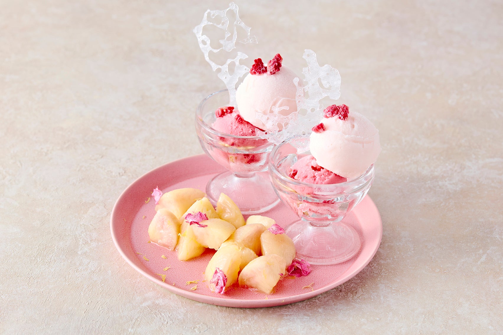 スタンド上段にはフレッシュな桃の果肉に花をあしらった“フレッシュピーチのフラワーマリネ”と、“白桃とラズベリーレモンのソルベ“、
