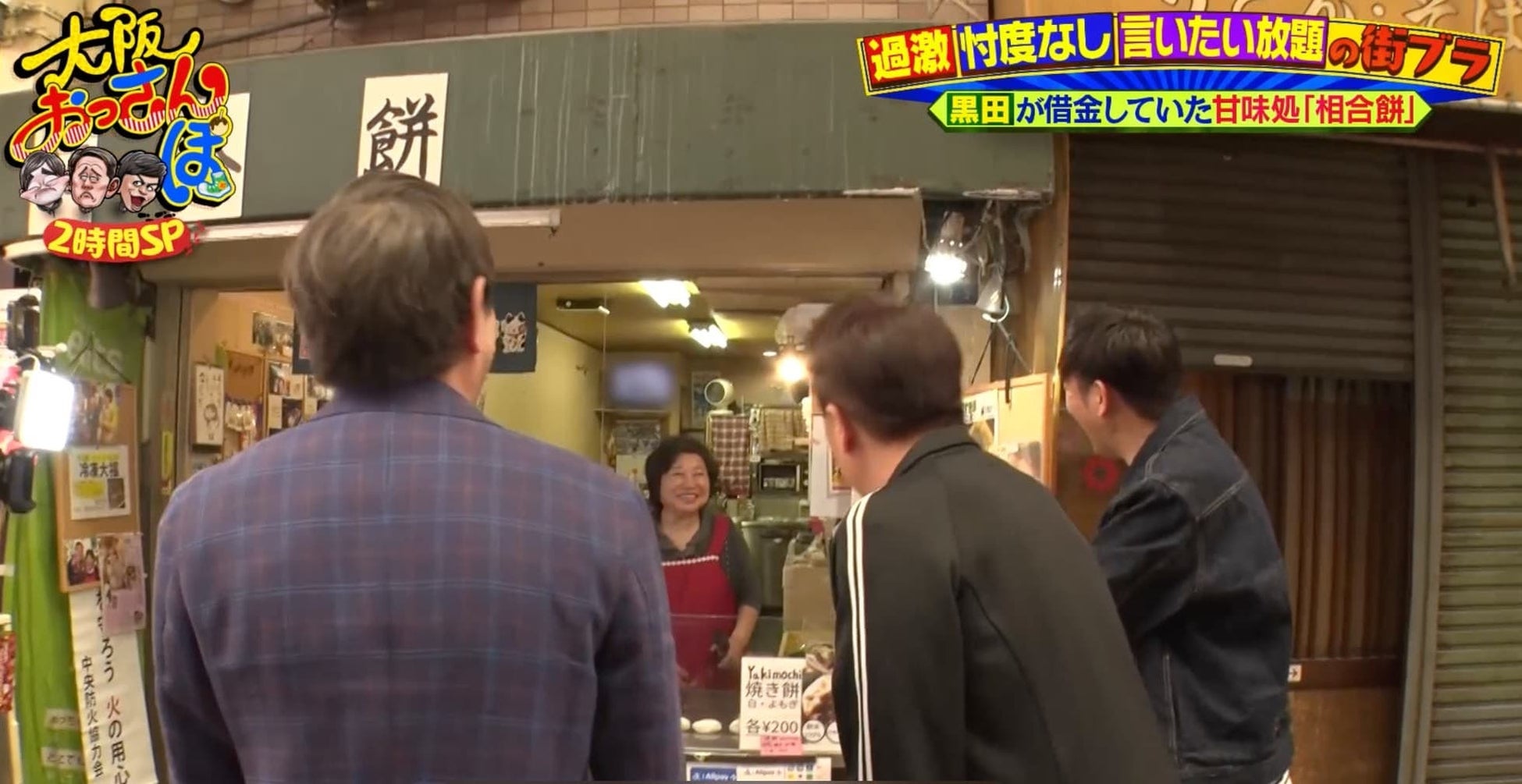 さっそく散策スタート。「なんば」は黒田にとって庭のような場所。中でも「相合橋」は思い出深く、黒田が若手時代にとても世話になった相合橋筋商店街の「相合餅」へ。当時の思い出話に花が咲く。