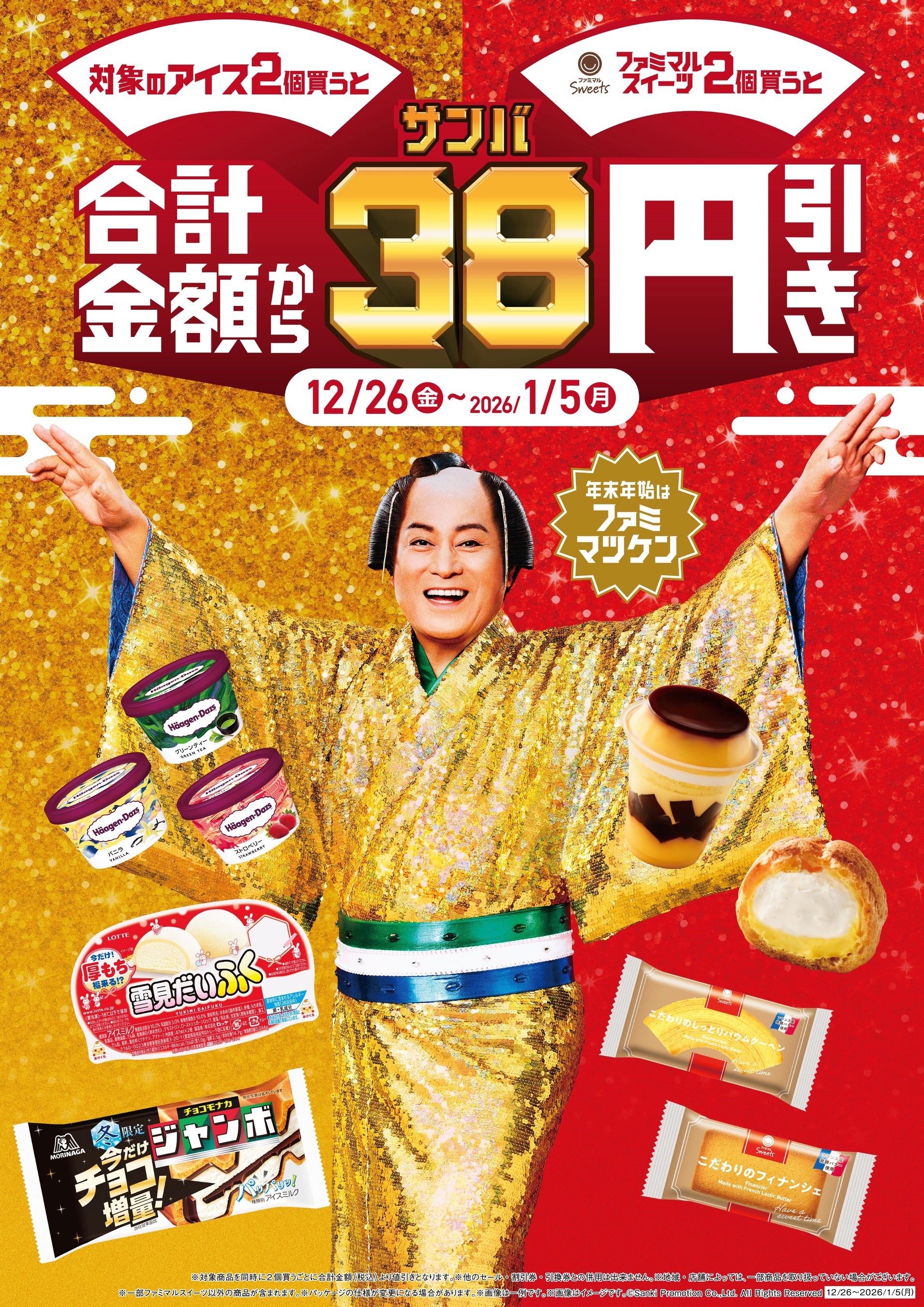 松平健さんのオリジナルグッズに続き、2025年12月26日(金)から2026年1月5日(月)までファミマのアプリ「ファミペイ」で総額約1億円相当のクーポン・ポイントがもらえる「ファミペイジャンボ」を開催いたします。さらに、同期間で対象のスイーツやアイスを2個同時に買うとサンバにちなんで合計金額から38円引きになる「38円(サンバ)引き」も実施いたします。年末年始にファミリーマートをご利用される皆さまが、明るい気持ちになるようなおトクなキャンペーンをご用意しております。