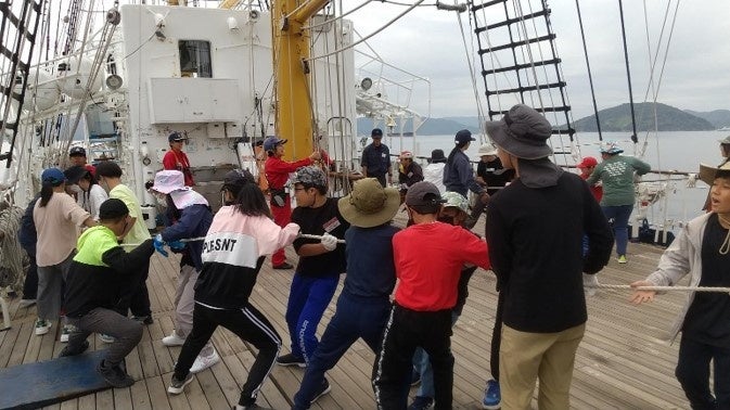 みんなで力を合わせてロープを引いて行うセイル展帆では、畳50枚分以上の巨大な帆が風を受けて、ぴんと張ったとき、子どもたちからは思わず拍手が湧き起こりました。船上での食事では、司厨長が腕によりをかけて作った料理を、晴天の中、メインデッキ上で風を受けながら食べました。