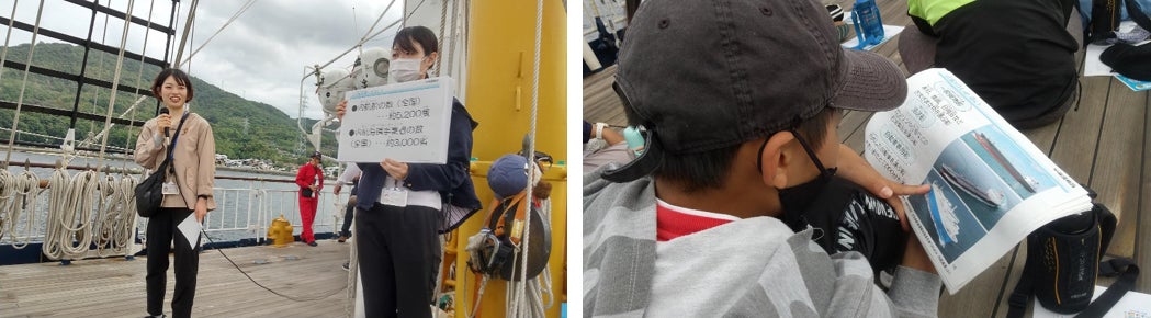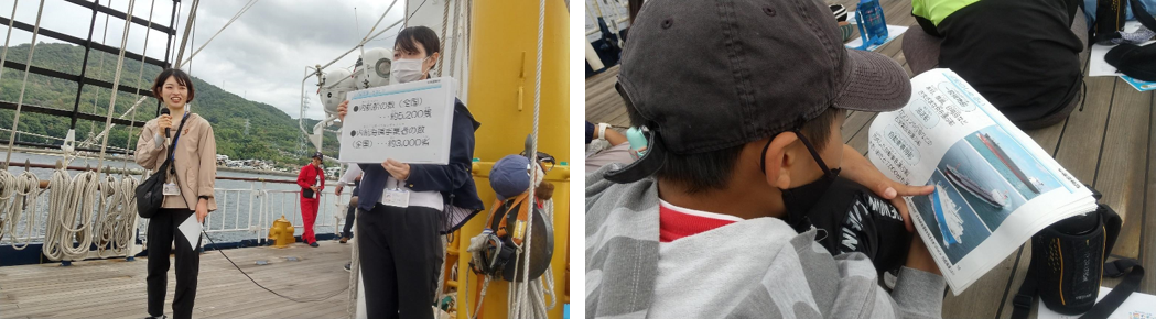 さらに、「帆船みらいへは何を運んでいるの?」という質問に対し、船長は「夢と希望と勇気かな?」とおどけながらも、帆船「みらいへ」が果たしている海洋教育の役割を説明。海の上で帆走中に船の役割や船で働くことを学ぶという、まさに「アクティブラーニング」といえる有意義な学びになりました。