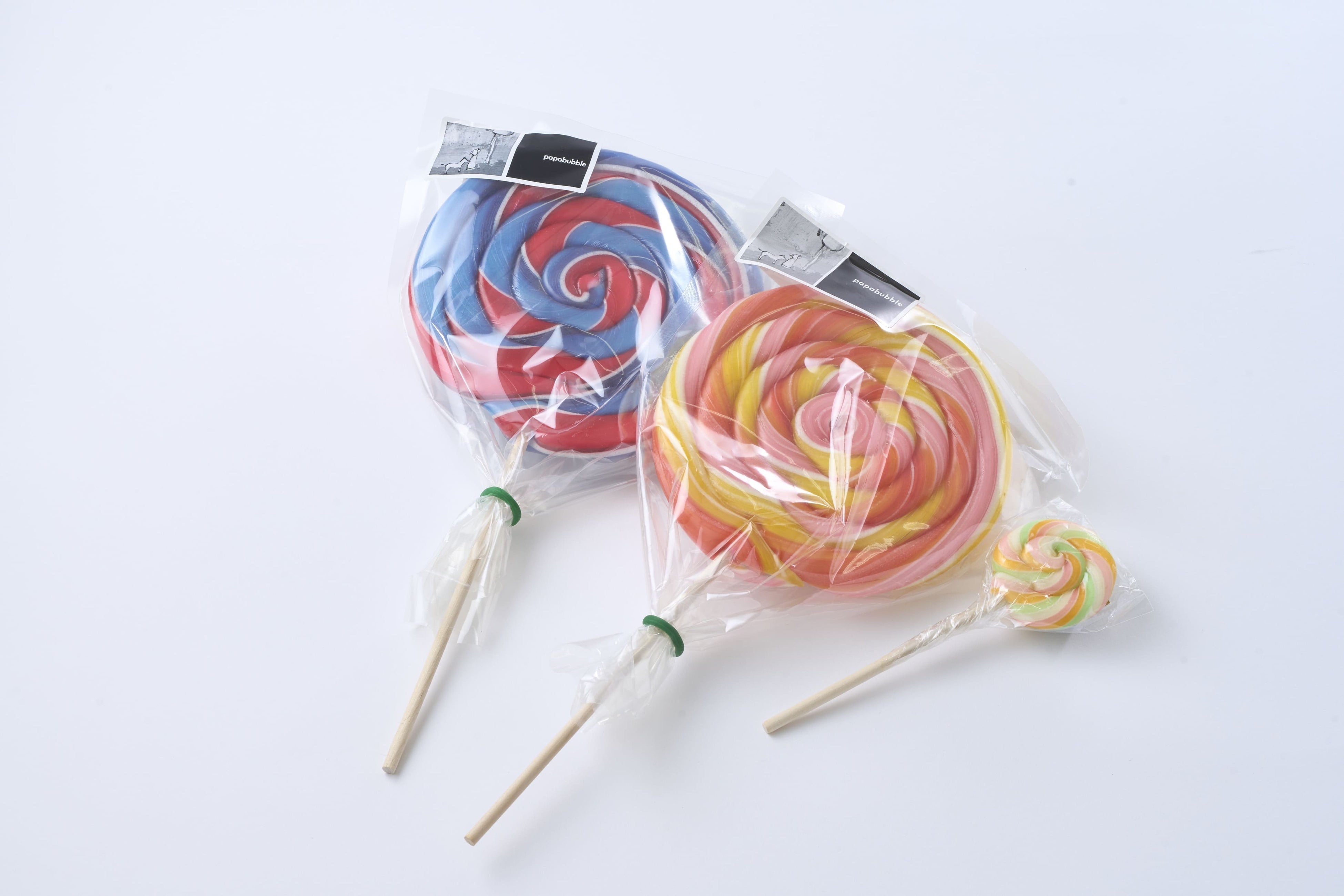 〈パパブブレ〉左・中)ロリポップ Lサイズ 1,780円、右)SSサイズ 380円
