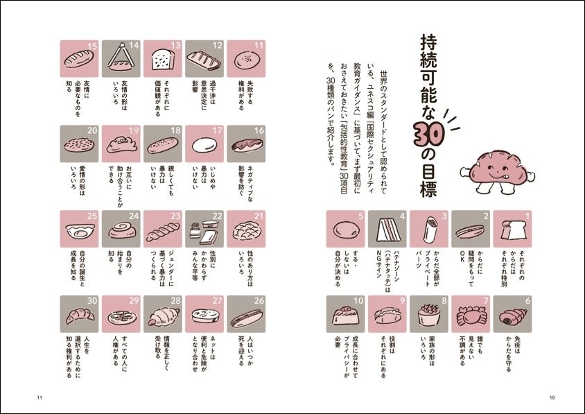 SDGsの持続可能な開発目標のように、包括的性教育の30項目を30種類のパンで紹介。