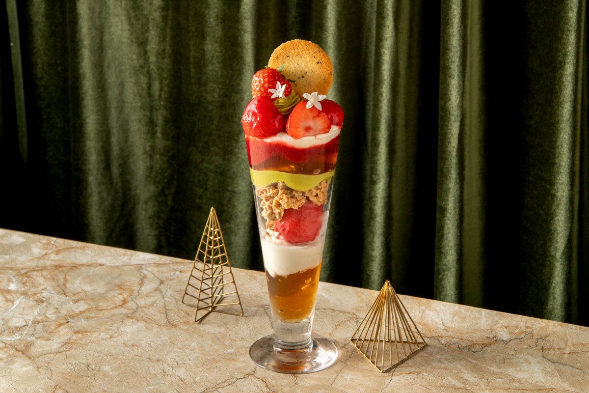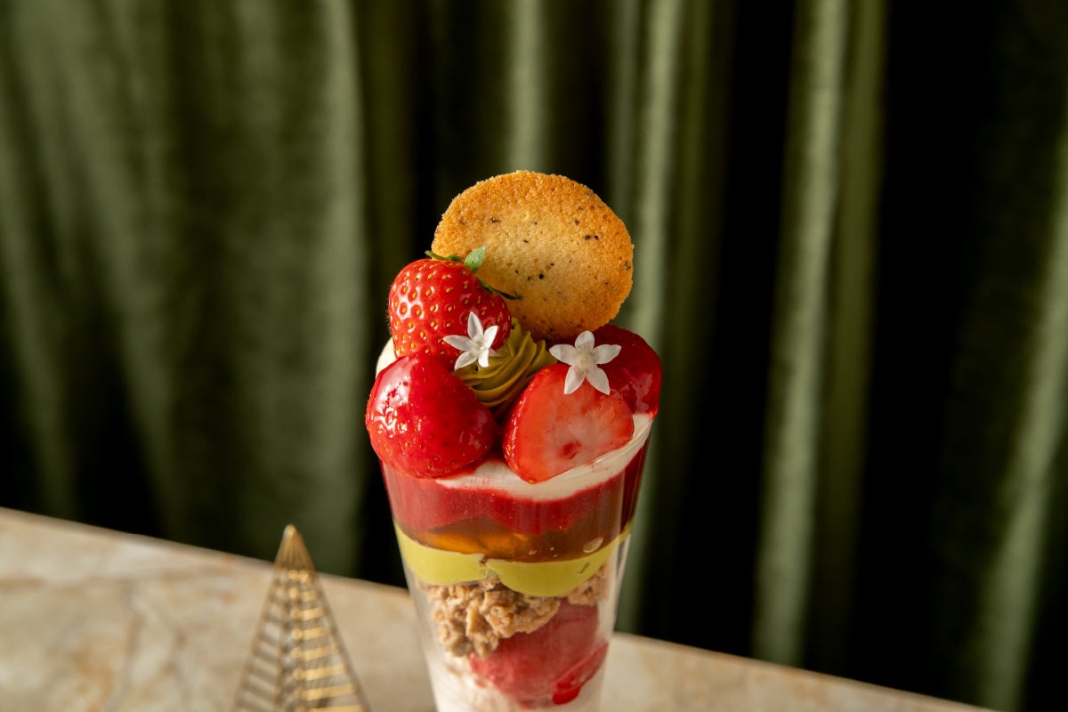 フレッシュな苺とコクのあるピスタチオクリーム、ブリアンローズが優しく香る紅茶のジュレを重ねた、パティシエ特製のクリスマス期間限定のパルフェ。