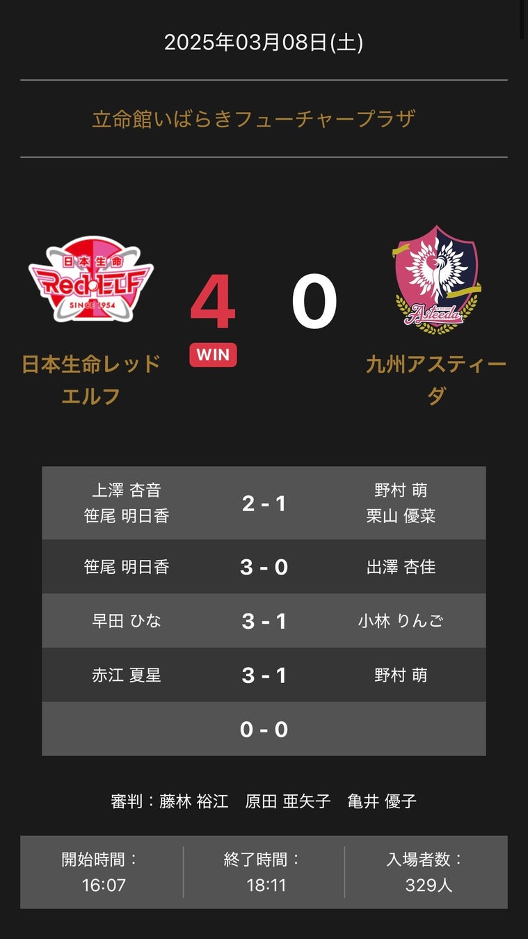 ノジマTリーグ 2024-2025シーズン 公式戦 3月8日開催 「日本生命レッドエルフvs 九州アスティーダ」の試合は、4-0で日本生命レッドエルフが勝利しました。