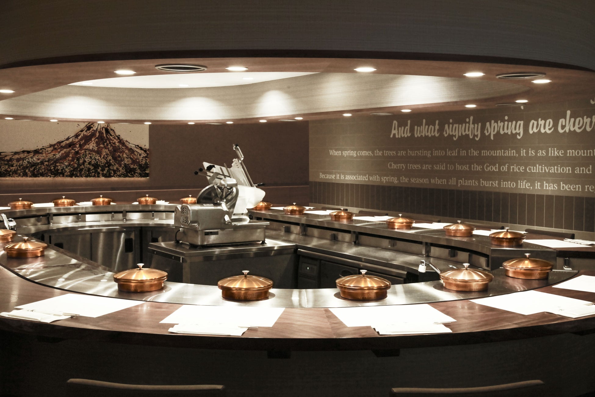 日本独自の食文化であるしゃぶしゃぶを、“一人しゃぶしゃぶ”で楽しんで頂くために、O型のカウンター席を中心に、一人に一鍋ずつご用意しています。伝統工芸の「曲げわっぱ」やオリジナルの銅鍋、掛川手織葛布の「のれん」など、各所に匠の技を体験出来るしつらえを施した空間でお迎えします。