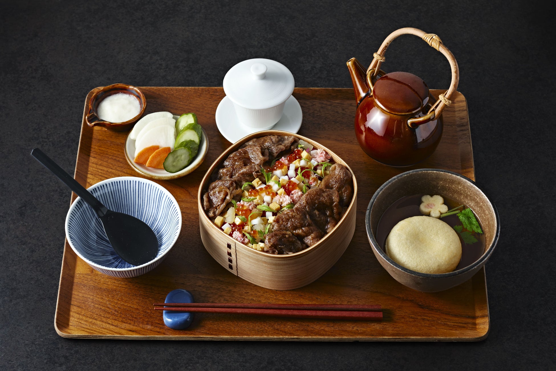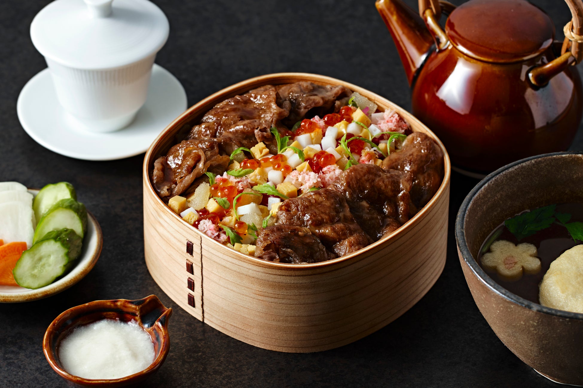 ■極上すき焼きといくらや蟹などの豪華な海の幸を、ひと口で楽しめる「特選焼きすき華ちらし」