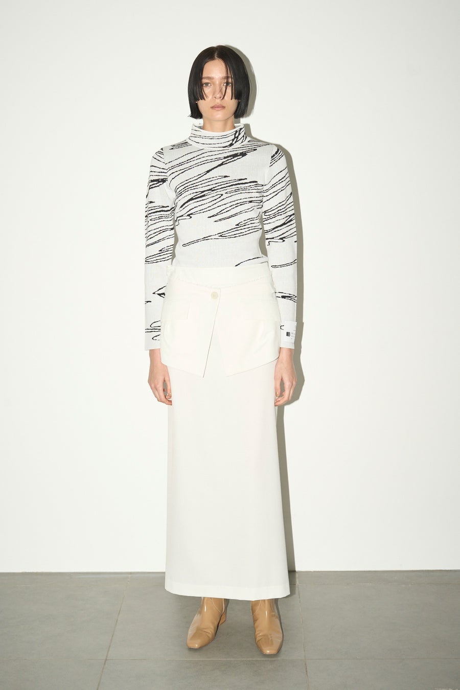 ダブルジャガード編みで仕立てたニットプルオーバーは綺麗に立ちあがる襟と、長めに設定した袖でモードな印象に仕上げたデザイン。立体的で体にフィットするサイジングがポイントです。