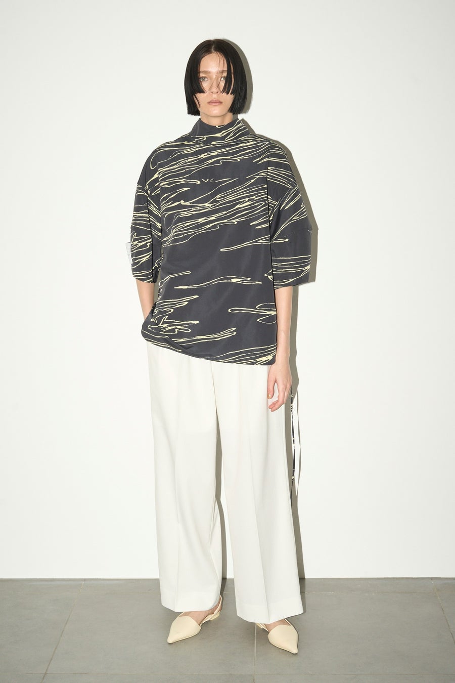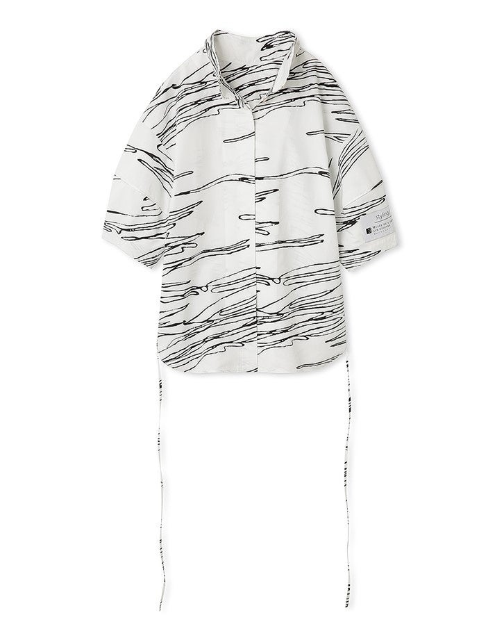 styling/で定評のある前後着用可能な2Way仕様で「オープンカラー」と「スタンドカラー」、どちらも楽しめるデザイン。身頃はミニマムに仕上げ、袖のボリュームが目を惹くバランスに。