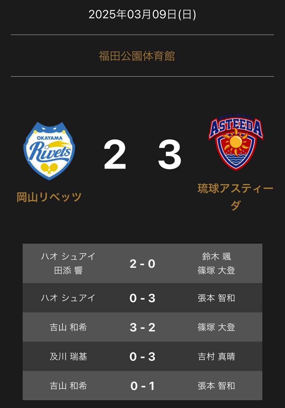 ノジマTリーグ 2024-2025シーズン 公式戦 3月9日開催 岡山リベッツ vs 琉球アスティーダ の試合は、2-3で琉球アスティーダが勝利しました。