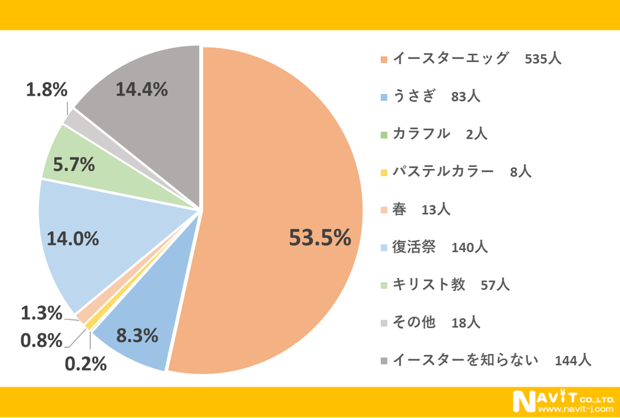 「イースターと聞いて最初にイメージするものは何ですか?」という質問については、「イースターエッグ」が53.5%、「復活祭」が14.0%、「うさぎ」が8.3%という順になりました。イースターエッグの卵のイメージを持っている方が多いようですね。