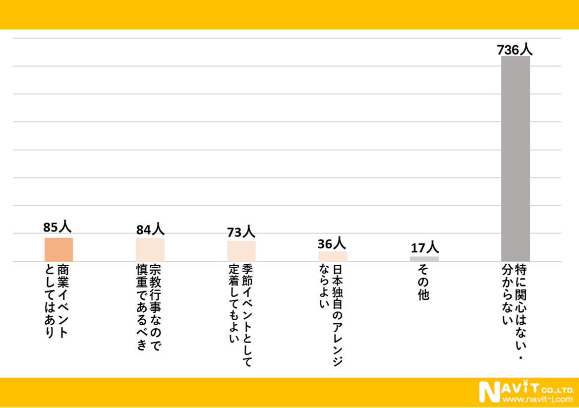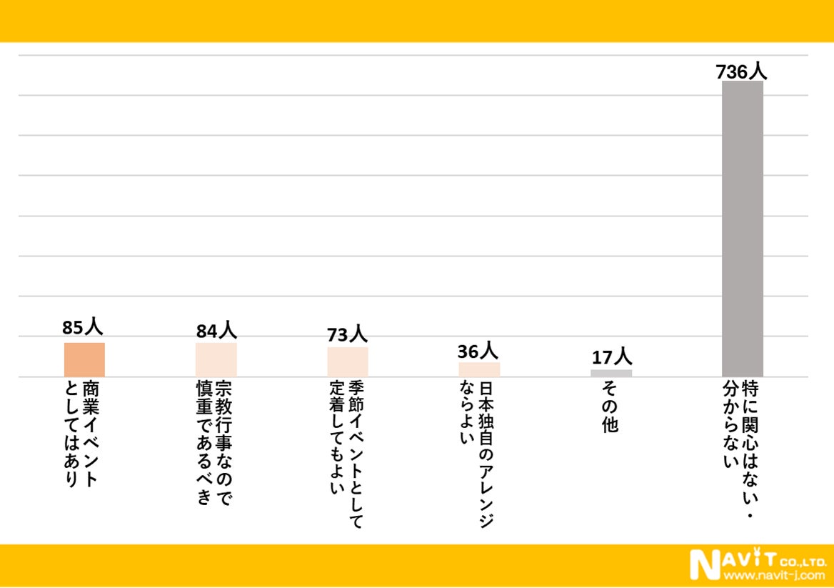 「イースターが日本で広まることについてどう思いますか?」という質問を複数選択可で行ったところ、「特に関心はない・分からない」が最も多く736人、「商業イベントとしてはあり」が85人、「宗教行事なので慎重であるべき」が84人と続きました。