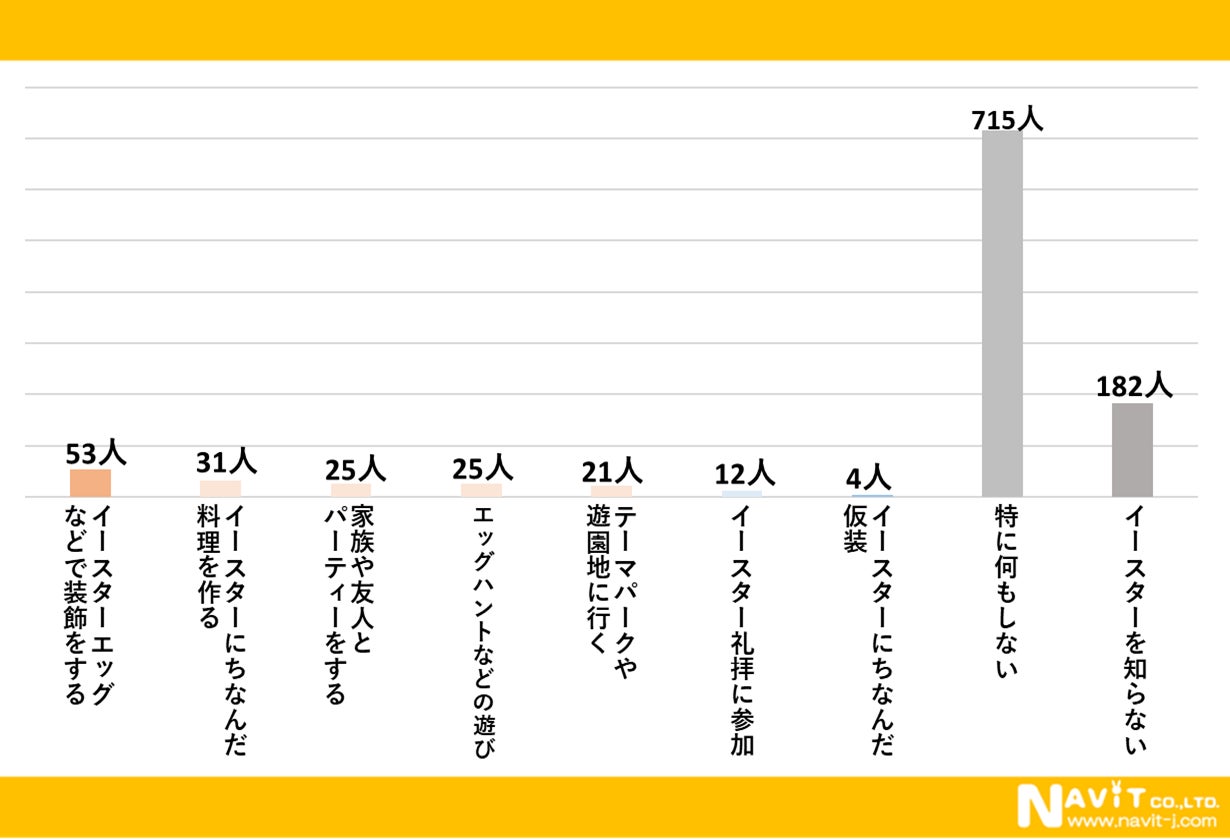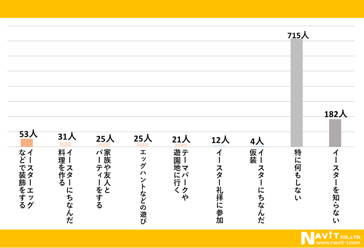 「イースターですること・したいことは何ですか?」という質問を複数回答可で行ったところ、「特に何もしない」が最も多く715人、「イースターエッグなどで装飾をする」が53人、「イースターにちなんだ料理を作る」が31人と続きました。