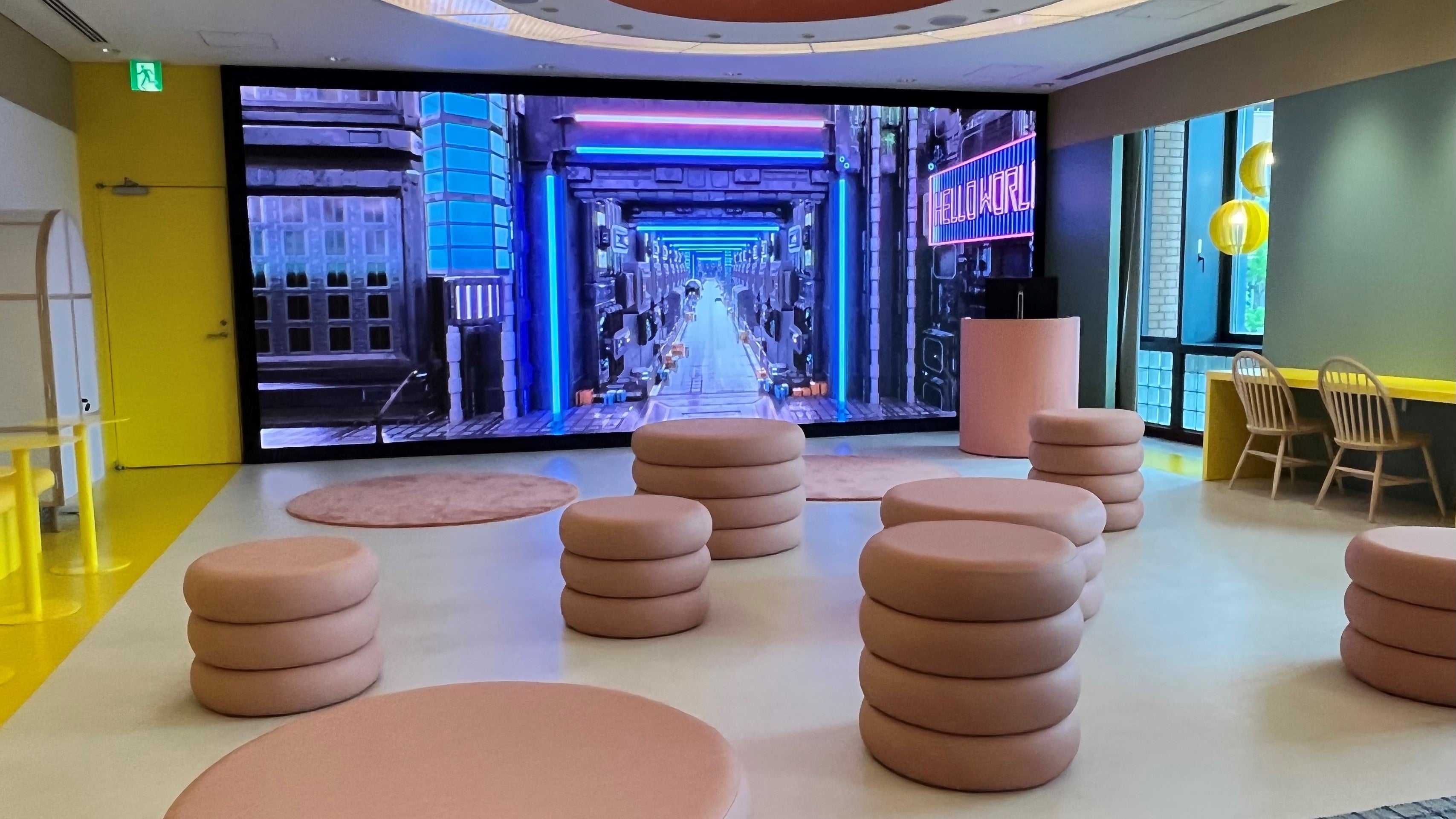 メインルーム奥には、幅6.6メートル・高さが2.7メートルもある「大型LEDビジョン」を備えています。