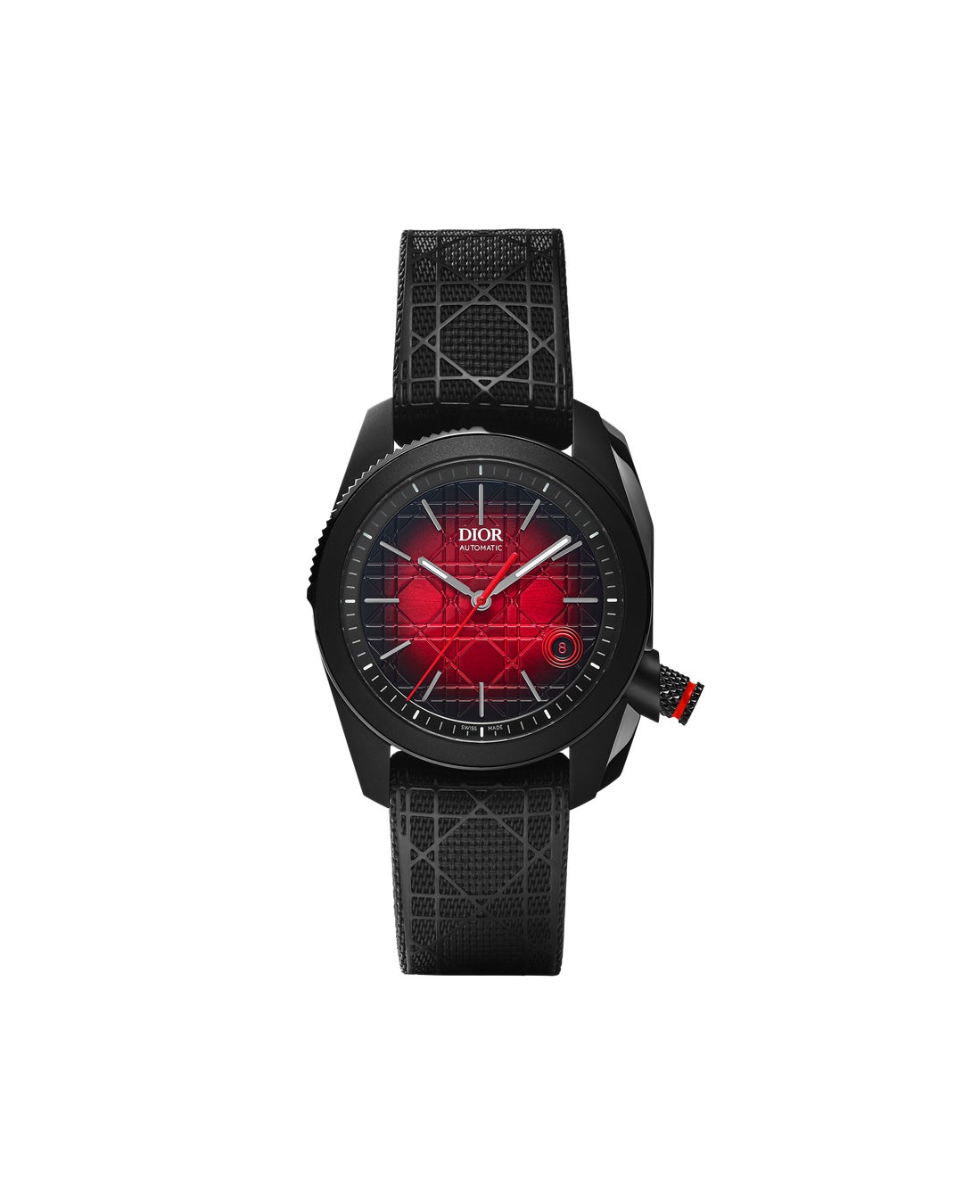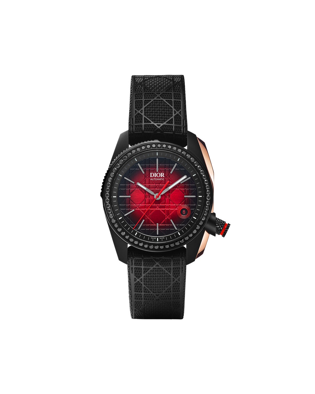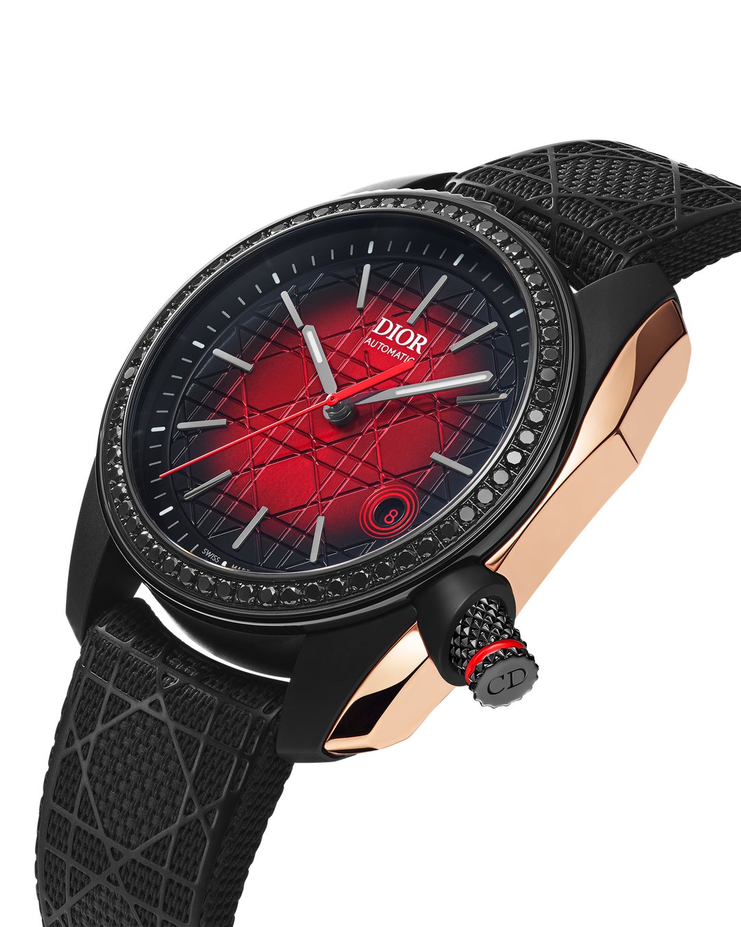 モダンに再解釈されたダイアルを際立たせるのは、漆黒の輪郭の中に配した魅惑的なレッドのグラデーション、波状の光沢が煌めくサンバースト仕上げとグラフィックな印象をもたらすカナージュ モチーフ デザインです。メゾンの永遠のシンボルはローターとインターチェンジャブル仕様のラバーストラップにもあしらわれ、ディオールのトータルルックを演出し、あらゆるコントラストを生み出すウルトラマット仕上げと光沢のあるディテールの組み合わせが、圧倒的な存在感で見る者を魅了する大胆な表情を付加します。