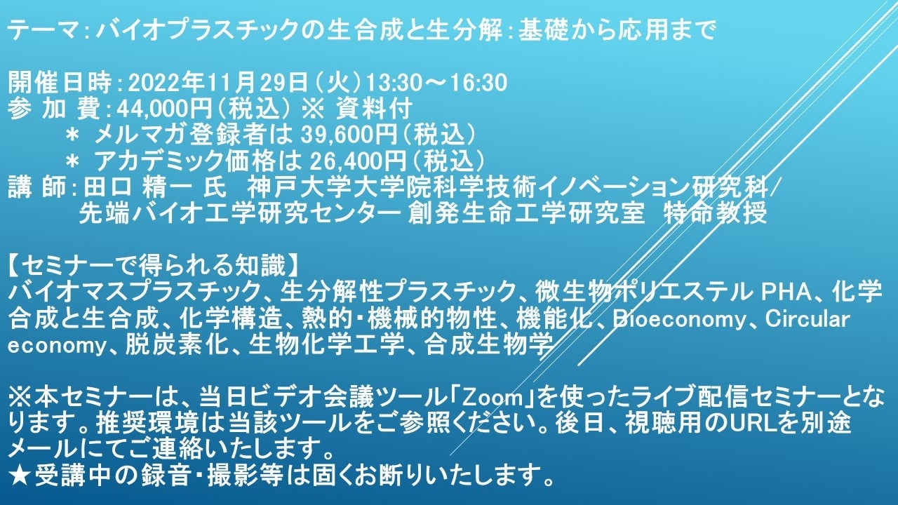 先端技術情報や市場情報を提供している(株)シーエムシー・リサーチ(千代田区神田錦町: https://cmcre.com/ )では、 各種材料・化学品などの市場動向・技術動向のセミナーや書籍発行を行っておりますが、 このたび「バイオプラスチックの生合成と生分解:基礎から応用まで」と題するセミナーを、 講師に田口 精一 氏 神戸大学大学院科学技術イノベーション研究科/先端バイオ工学研究センター 創発生命工学研究室 特命教授)をお迎えし、2022年11月29日(火)13:30より、 ZOOMを利用したライブ配信で開催いたします。 受講料は、 一般:44,000円(税込)、 弊社メルマガ会員:39,600円(税込)、 アカデミック価格は26,400円(税込)となっております(資料付)。