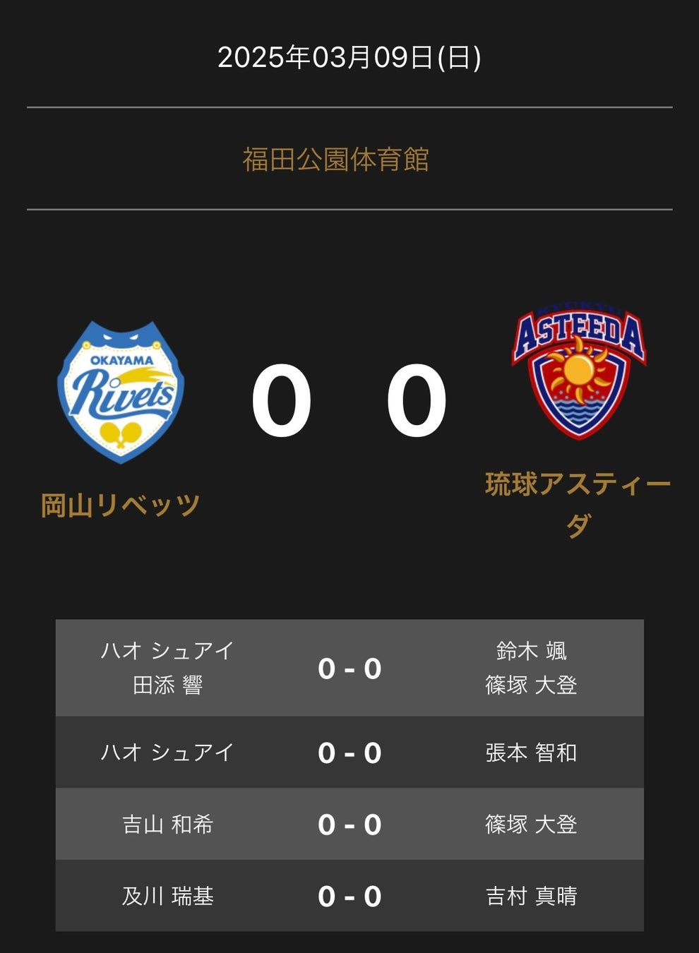 ノジマTリーグ 2024-2025シーズン 公式戦 3月9日開催 岡山リベッツ vs 琉球アスティーダ 対戦オーダー発表