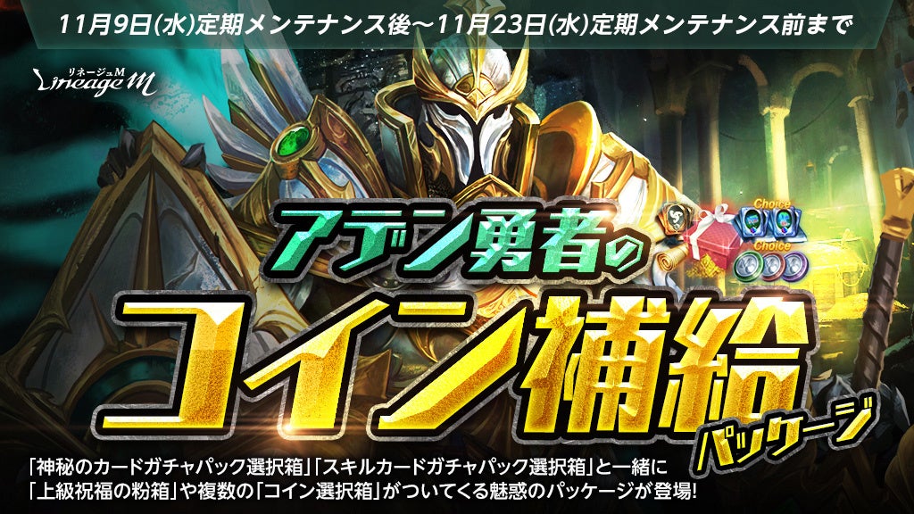 「神秘のカードガチャパック選択箱」1個、「スキルカードガチャパック箱(イベント)」2個、「上級祝福の粉箱」1個、「コイン選択箱」5個がセットになった「アデン勇者のコイン補給パッケージ」が登場しました。