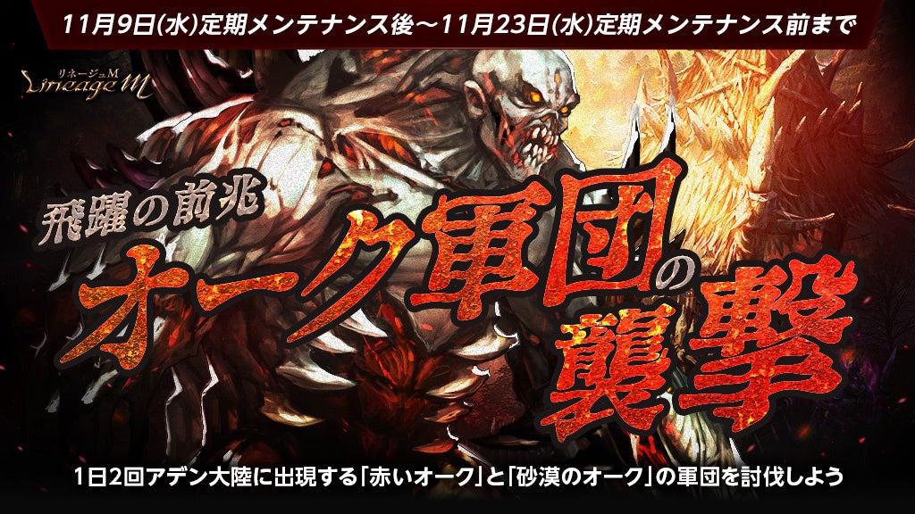 PCオンラインRPG「リネージュ」のモバイル版タイトル『Lineage M(以下、リネージュM)』のサービス、運営をしているエヌ・シー・ジャパン株式会社(東京都港区、代表取締役:金 澤憲(キム テクホン) 以下、エヌシージャパン)は、2022年11月9日(水)に、次期大型アップデートに関するティザーイメージの公開およびカウントダウンの開始、イベント「飛躍の前兆 オーク軍団の襲撃」、「日ノ本ダンジョン入場時間延長」の開催、および各種パッケージの登場をお知らせします。