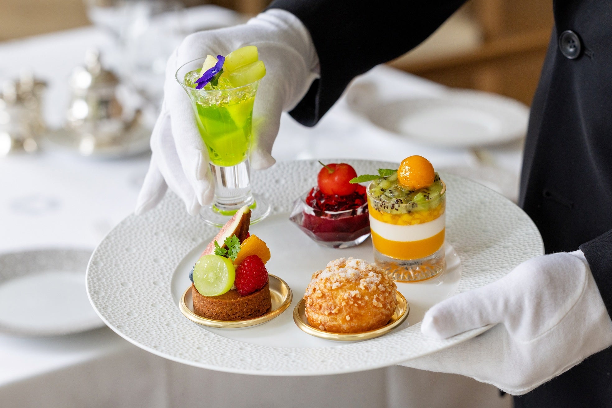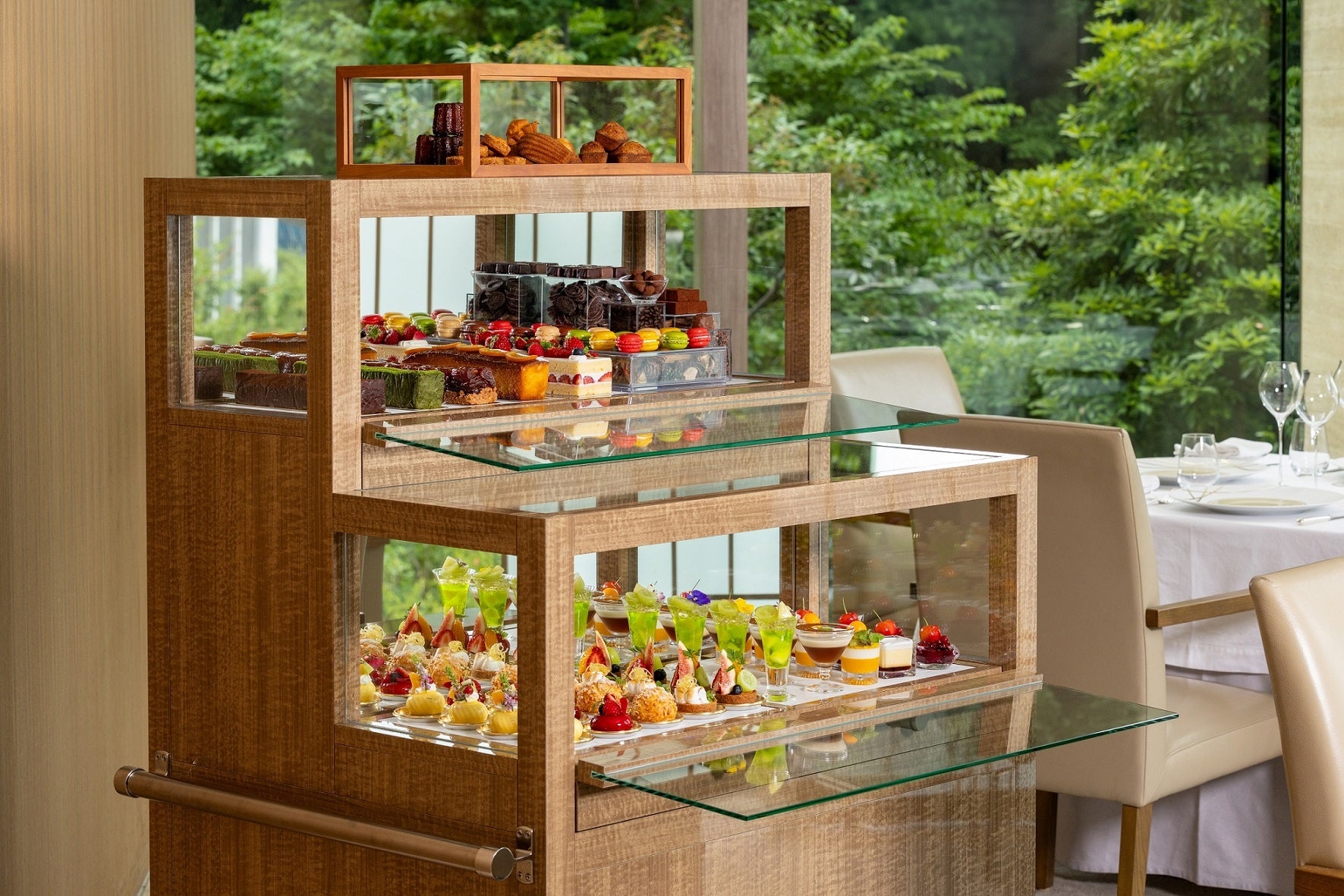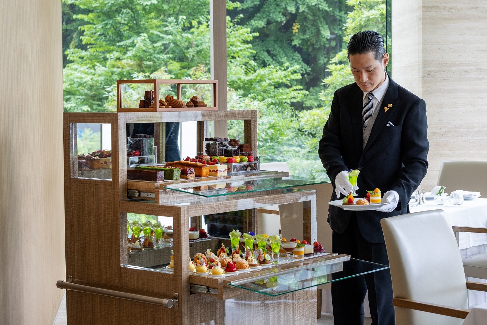 一方、荒木はパティシエとしての研鑽に加え、日本料理「吉兆」やフランス料理「オテル・ドゥ・ミクニ」でのシェフ経験を有しており、そのユニークな経歴を活かし、幅広い食材を取り入れ、料理全体と響き合うデセールの創造を得意としています。この新体制のもと、新たに考案された平日限定「デザートワゴンランチ」は、食後のデザートをワゴンでお席までお届けし、多彩なスイーツをお好きなだけお愉しみいただけます。