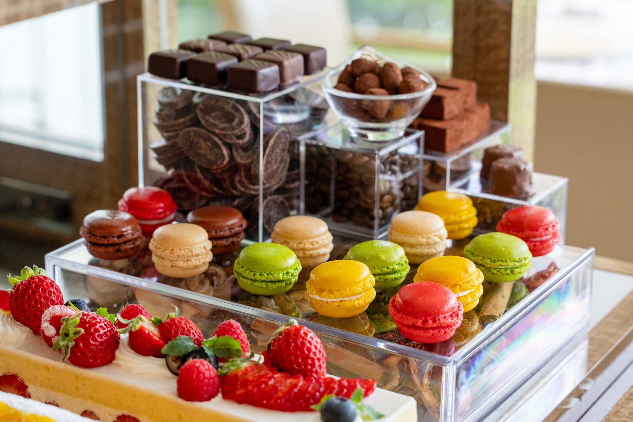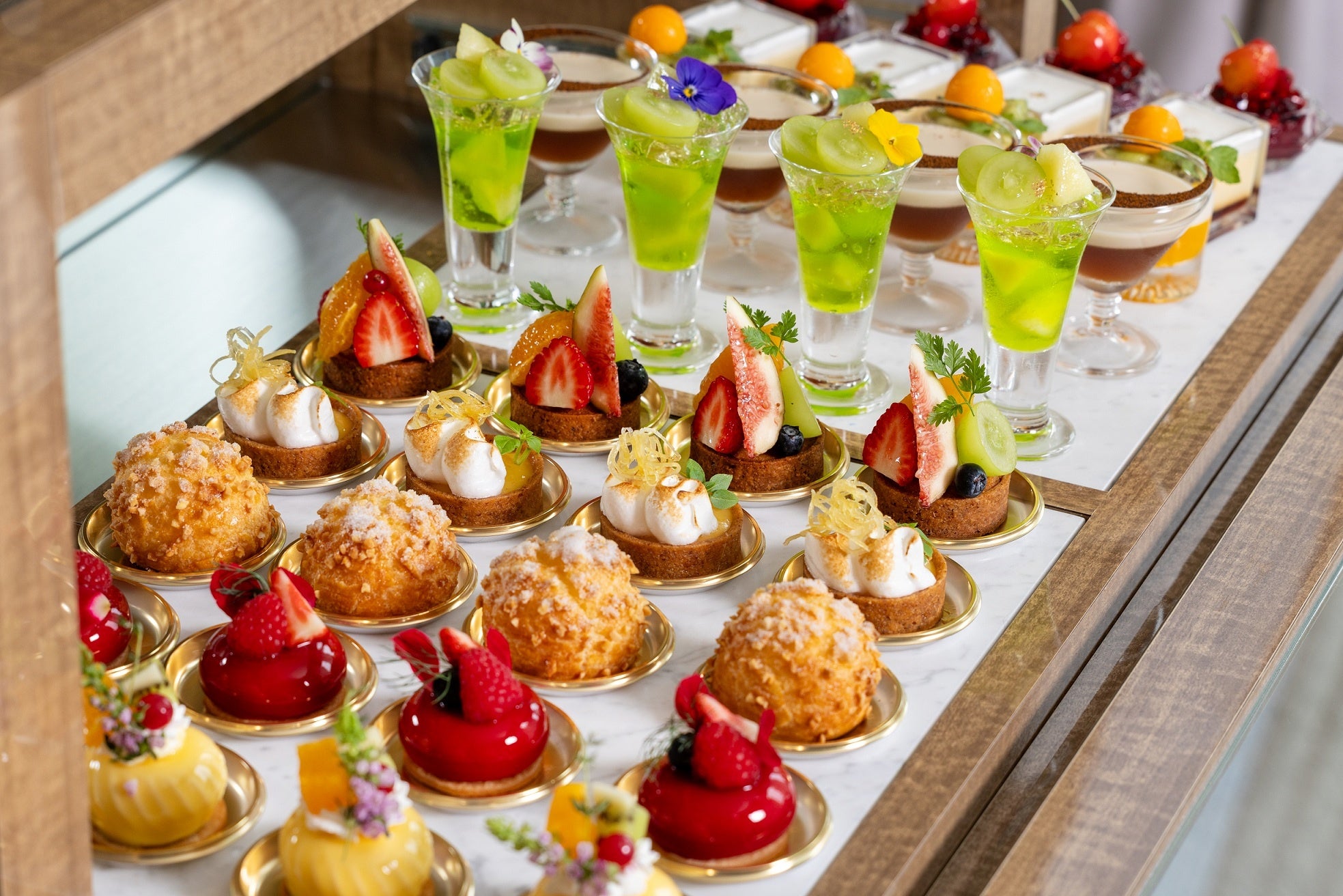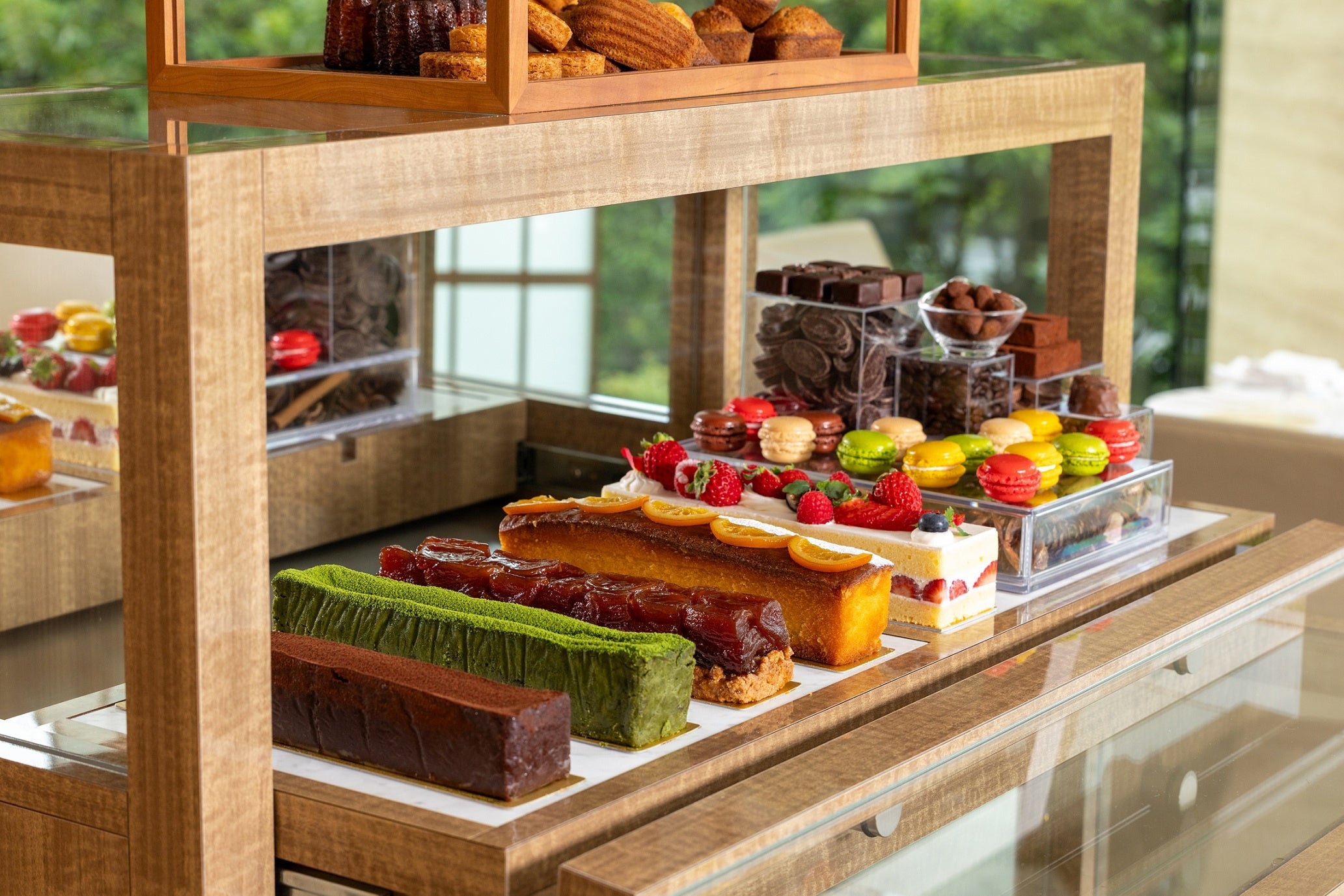 一方、荒木はパティシエとしての研鑽に加え、日本料理「吉兆」やフランス料理「オテル・ドゥ・ミクニ」でのシェフ経験を有しており、そのユニークな経歴を活かし、幅広い食材を取り入れ、料理全体と響き合うデセールの創造を得意としています。この新体制のもと、新たに考案された平日限定「デザートワゴンランチ」は、食後のデザートをワゴンでお席までお届けし、多彩なスイーツをお好きなだけお愉しみいただけます。