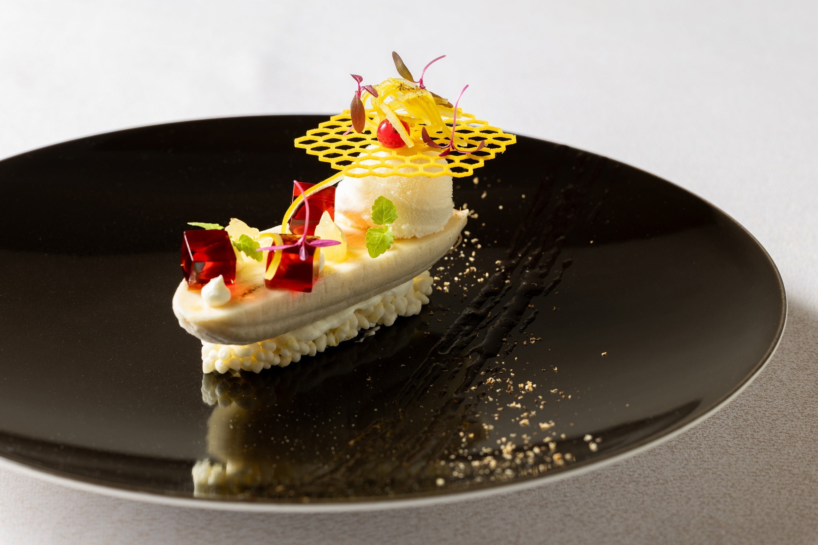 沖縄県産島バナナと国産レモンのコンポート アーモンドとトンカ豆の香りとともに