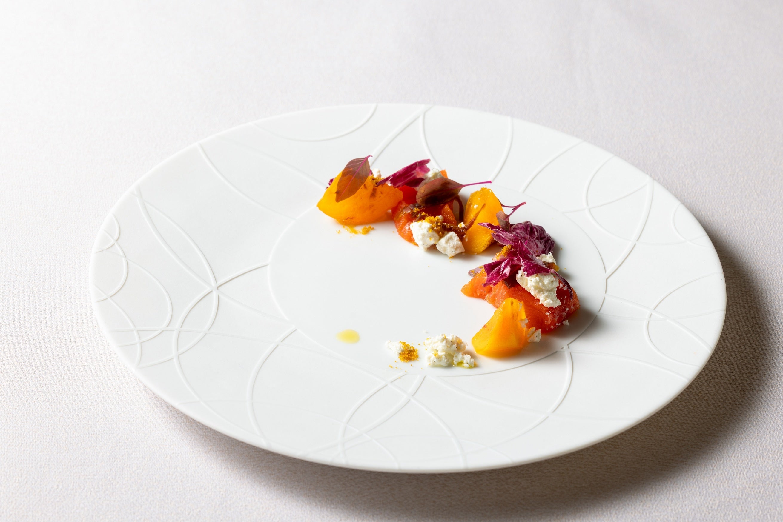 みやぎサーモンのミキュイと柿のマリネ リコッタチーズに奈良漬のアクセント