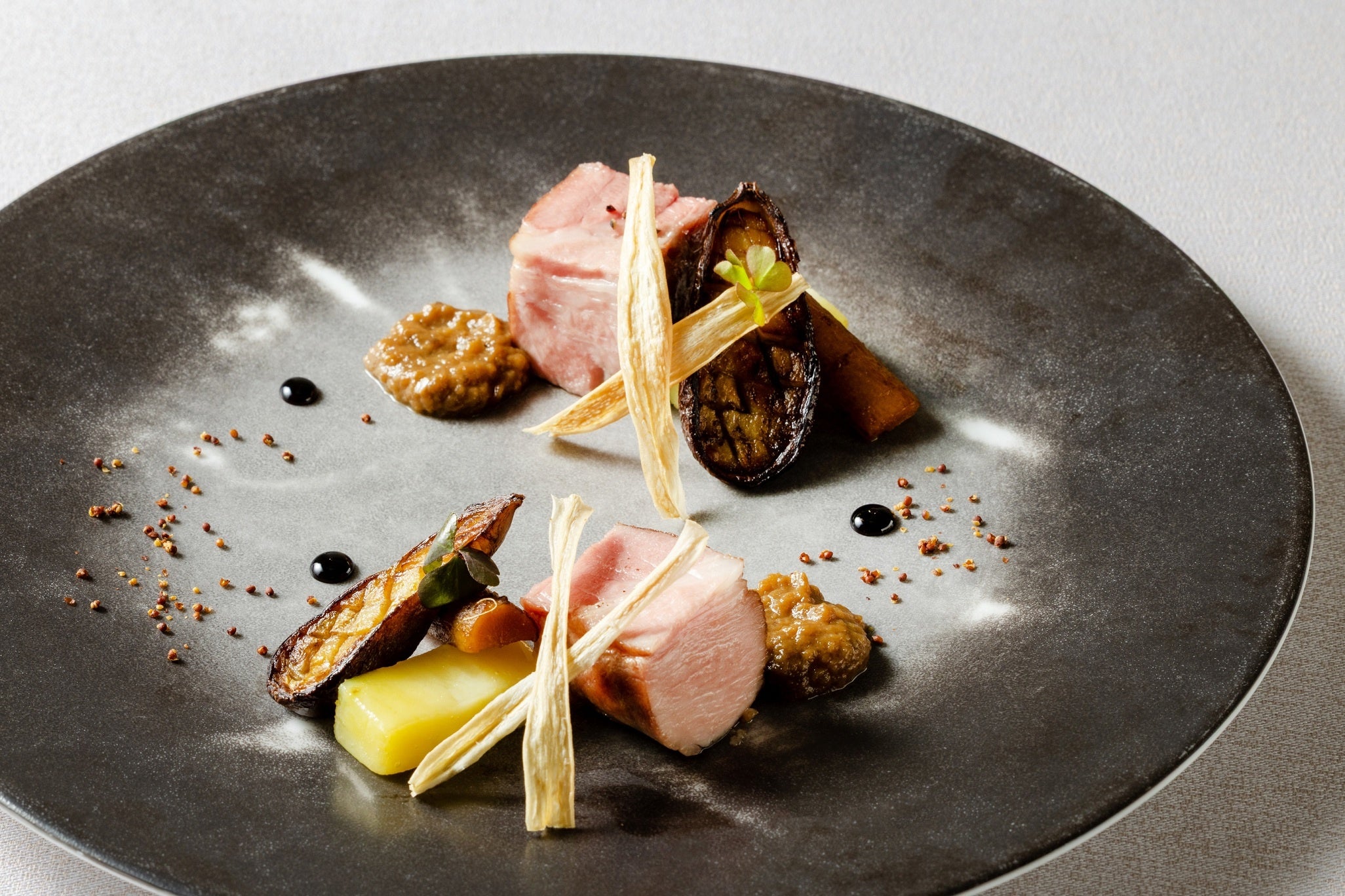 備長炭で炙った金華豚と秋茄子のソース 甘酸っぱい紅はるかとごぼう