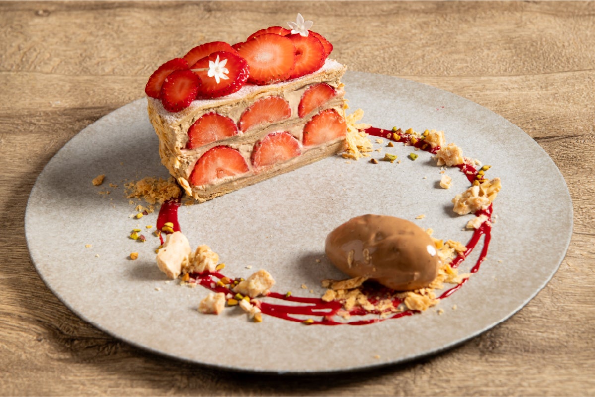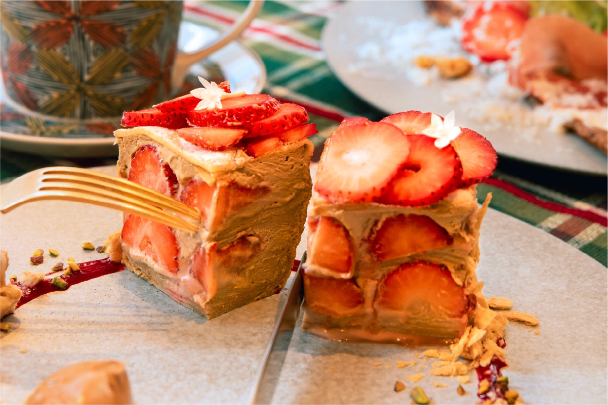 ミルクティー香るクリームを何層にも重ね、仕上げに苺を飾り、ミルクレープ仕立てに。