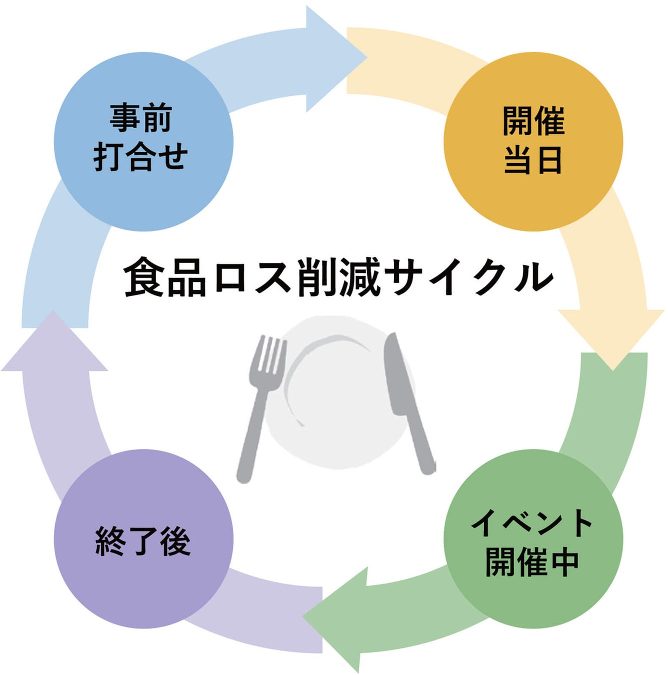 宴会料理の食べ残し量は食堂・レストランの食べ残し量の約3.5倍にもなるという課題に対し、宴会場を持つホテル全てで「3010運動」(乾杯後30分、お開き10分前に「食べきりタイム」を設ける)を積極的に推進しています。また、事前打ち合わせ(メニュー構成の精査)から、開催当日(盛り付け方の工夫、適量提供の声かけ)、終了後(残量データの次回への活用)まで、食品ロス削減サイクルを循環させることで完食率アップにつなげています。