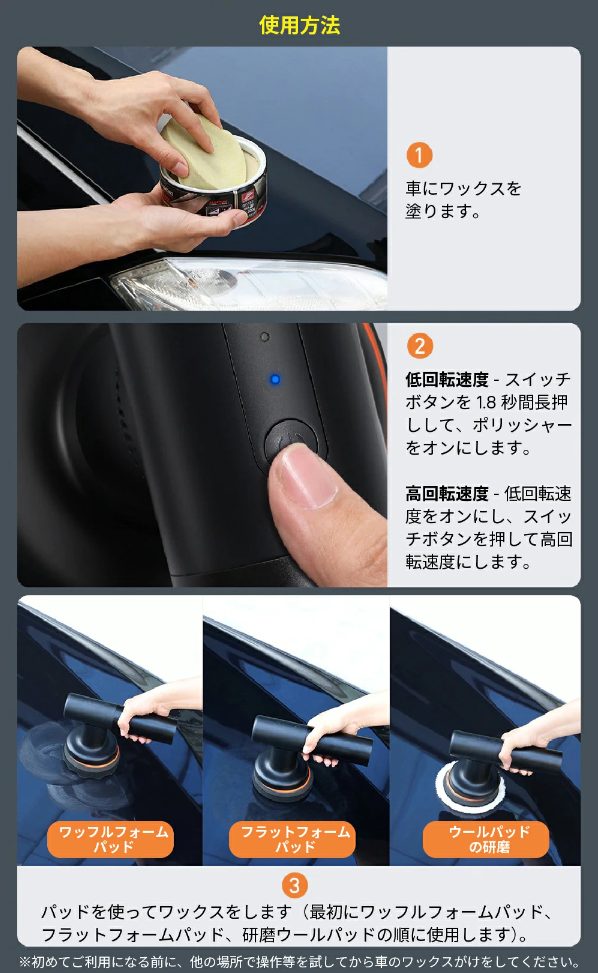 ●ワックスがけの段階に合わせた、3種の取り替えパッド付属