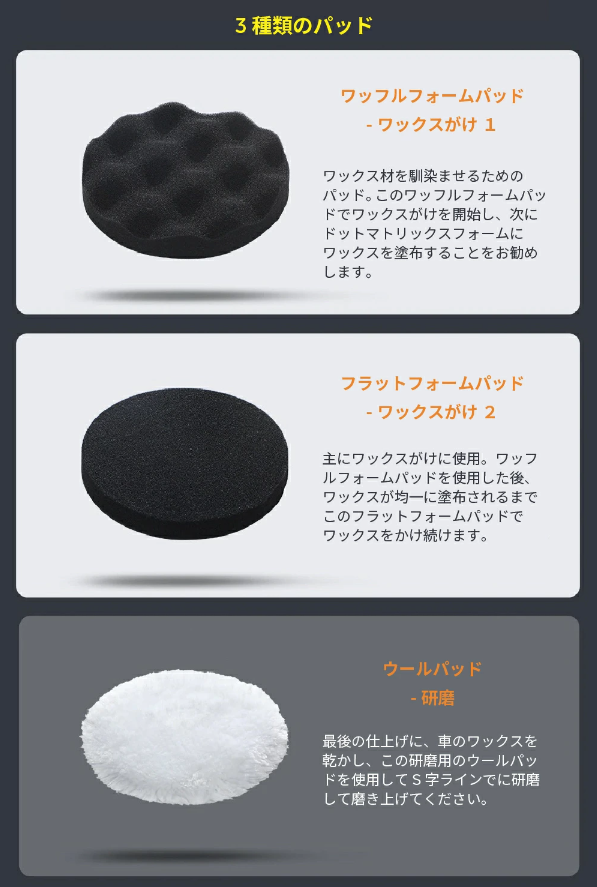 ワックスがけの行程に合わせた、3つのパッドが付属