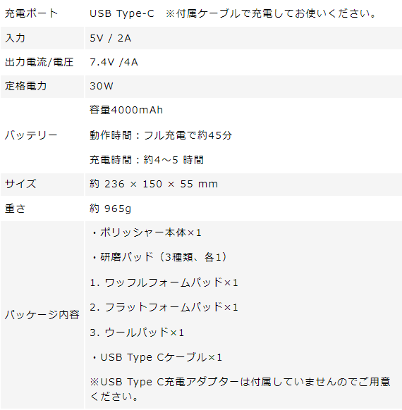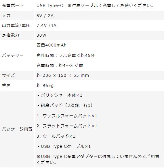 【USB-C充電式ワイヤレス/45分間 稼働/低騒音/3種類の研磨パッド付属】