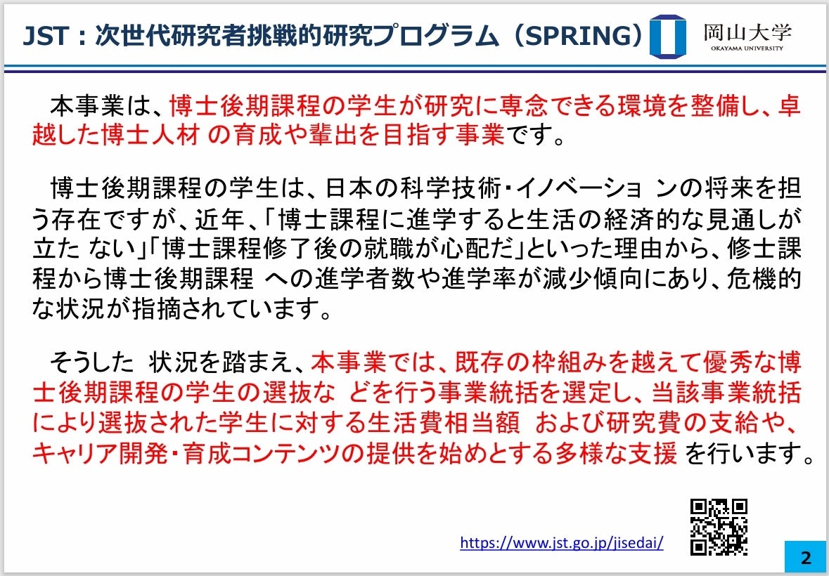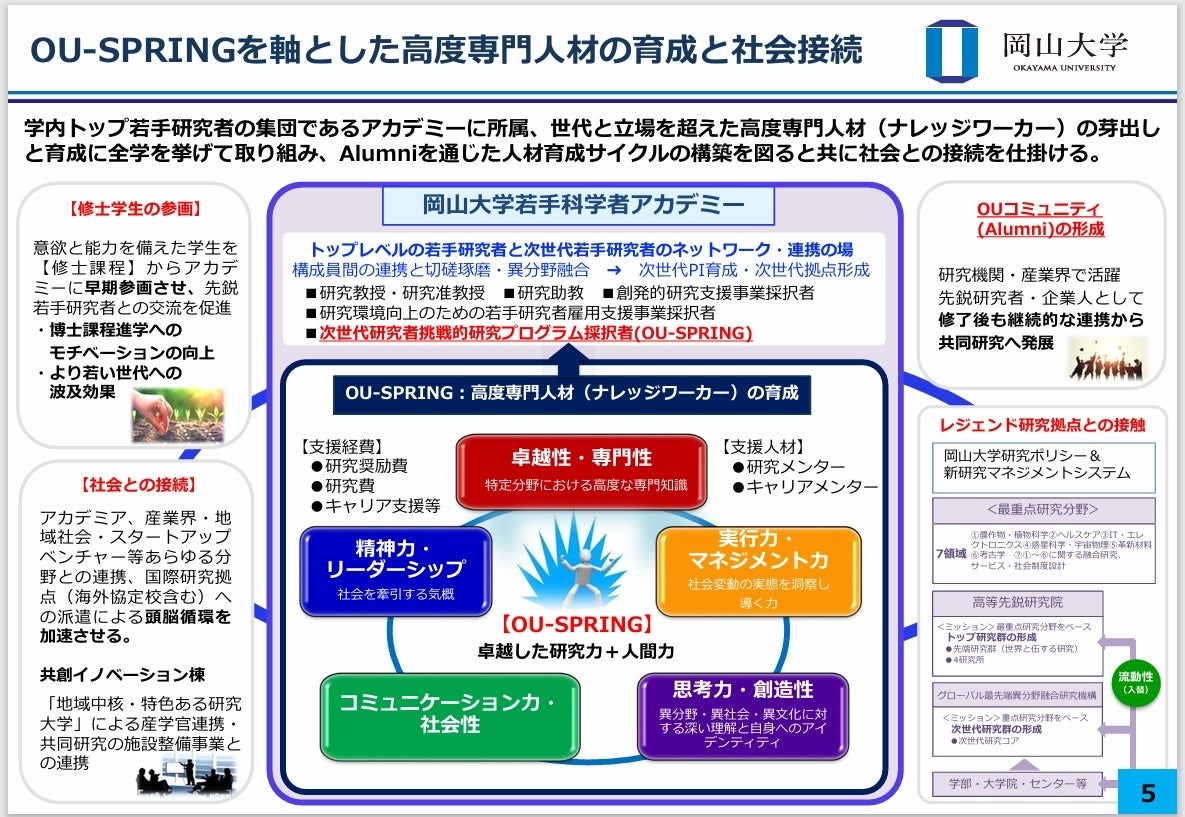 【岡山大学】JST「次世代研究者挑戦的研究プログラム(SPRING)」に採択 ~高度な知識と未来思考で社会変革を導く博士人材育成プログラム(OU-SPRING)を実施へ~
