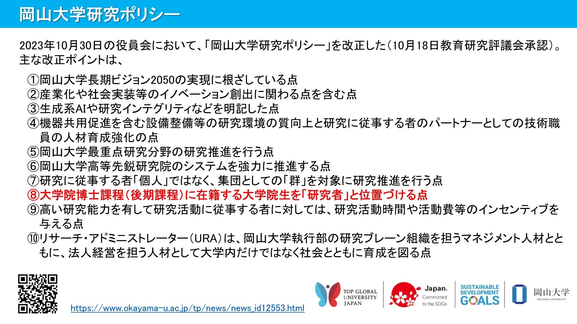 ・【岡山大学】岡山大学長期ビジョン2050をより確実に実現させ、社会変革を起こす”力”がある研究大学:岡山大学を目指して「岡山大学研究ポリシー」を改正