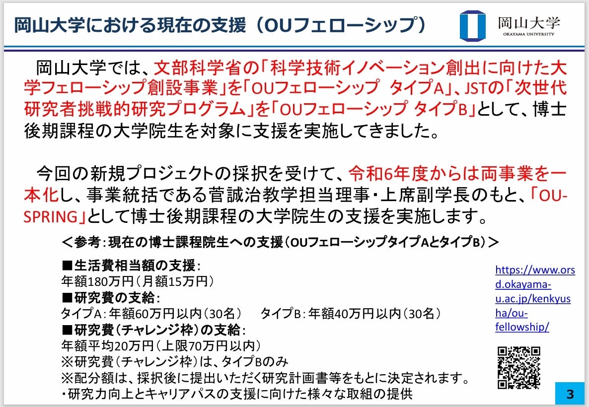 岡山大学では、これまで文部科学省の「科学技術イノベーション創出に向けた大学フェローシップ創設事業」を「OUフェローシップ タイプA」、JSTの「次世代研究者挑戦的研究プログラム」を「OUフェローシップ タイプB」として、博士後期課程の大学院生を対象に支援を実施してきました。今回の新規プロジェクトの採択を受けて、令和6年度からは両事業を一本化し、事業統括である菅誠治教学担当理事・上席副学長のもと、「OU-SPRING」として博士後期課程の大学院生の支援を実施します。