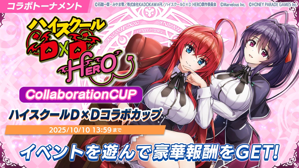 ハイスクールD×D HEROコラボ第2弾開催を記念してコラボトーナメント「ハイスクールD×Dコラボカップ」を開催いたします!コラボカップで入手できるアイテムを集めると潜在解放の雫やドルフィンの育成素材など様々なアイテムと交換が行えます!