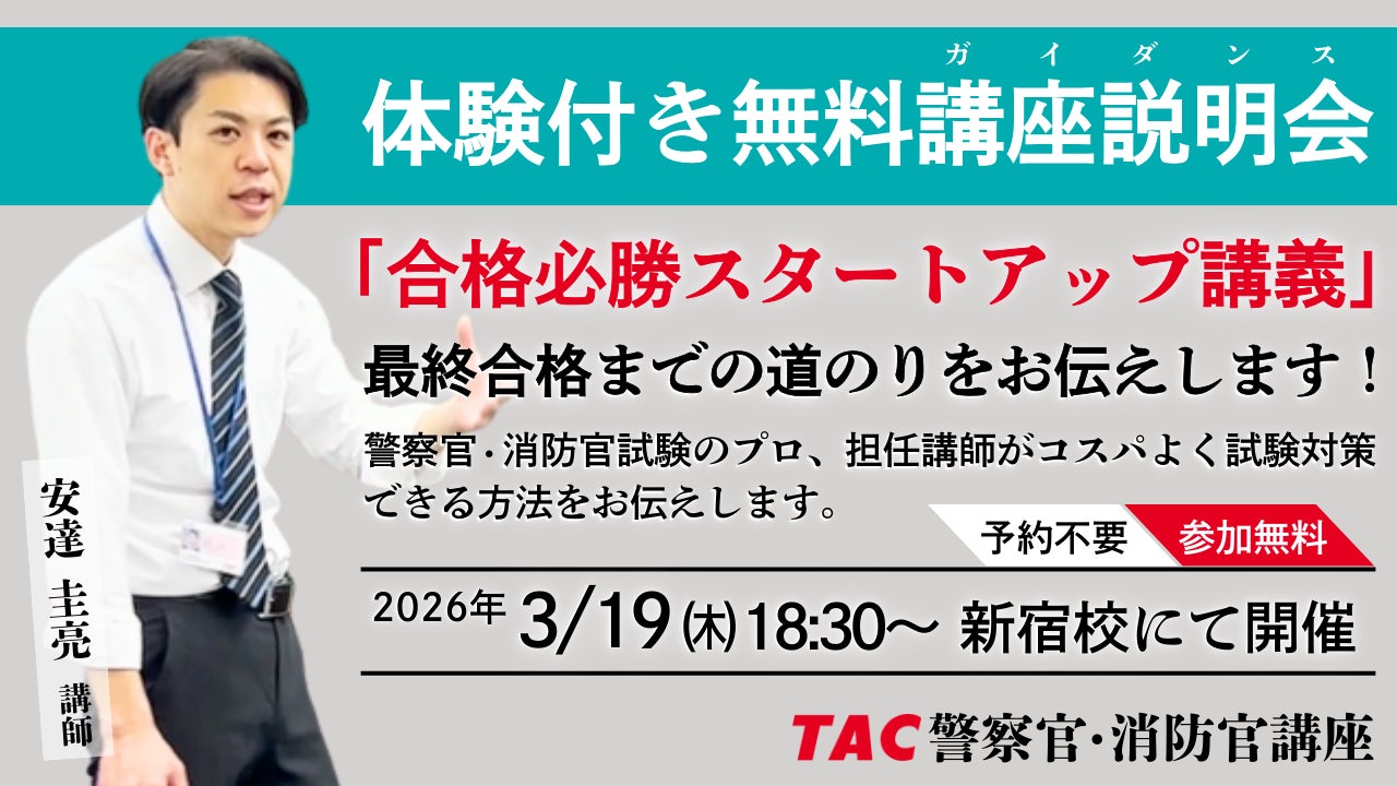 資格取得に向けた教育サービスを展開しているTAC株式会社(東京都千代田区、代表取締役社長:多田 敏男)では、警察官・消防官採用試験を検討されている皆様へ向けて「合格必勝スタートアップ講義~合格までの道のりをお伝えします~」を、2026年3月19日(木)にTAC新宿校で開催します。
