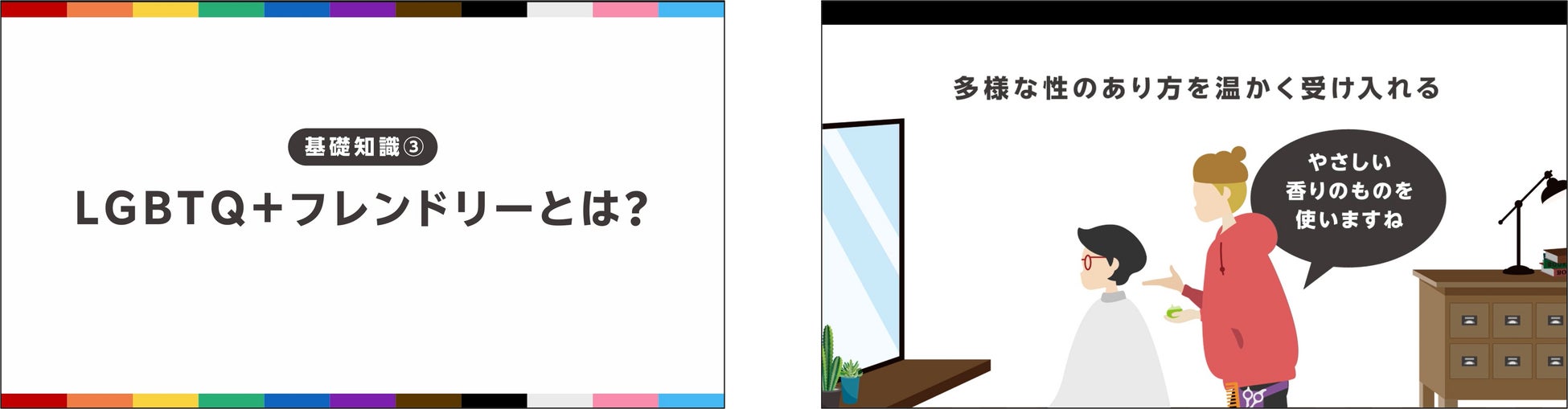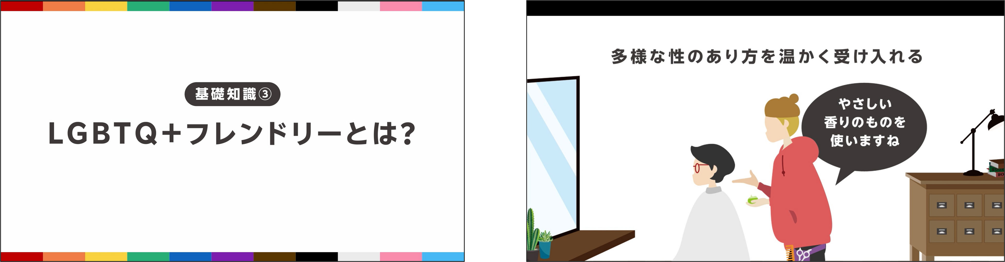 LGBTQ+フレンドリーな接客を推進することを目的に、「LGBTQ+フレンドリーサロン 虎の巻」を通じて、美容サロンのオーナー・従業員向けに、多様な性のあり方に関する基礎知識や接客方法、サロンづくりなどについて動画を公開