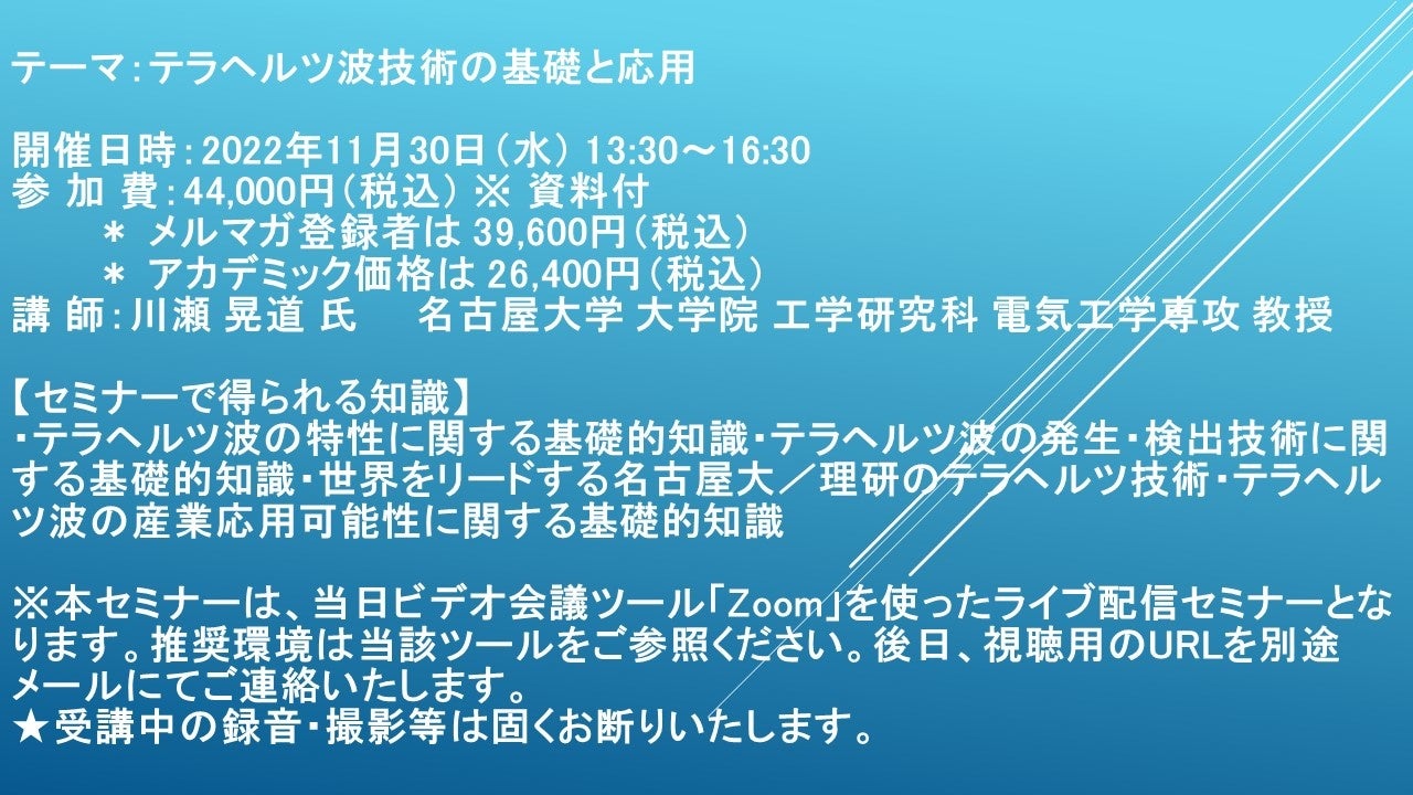 先端技術情報や市場情報を提供している(株)シーエムシー・リサーチ(千代田区神田錦町: https://cmcre.com/ )では、 各種材料・化学品などの市場動向・技術動向のセミナーや書籍発行を行っておりますが、 このたび「テラヘルツ波技術の基礎と応用」と題するセミナーを、 講師に川瀬 晃道 氏 名古屋大学 大学院 工学研究科 電気工学専攻 教授)をお迎えし、2022年11月30日(水)13:30より、 ZOOMを利用したライブ配信で開催いたします。 受講料は、 一般:44,000円(税込)、 弊社メルマガ会員:39,600円(税込)、 アカデミック価格は26,400円(税込)となっております(資料付)。