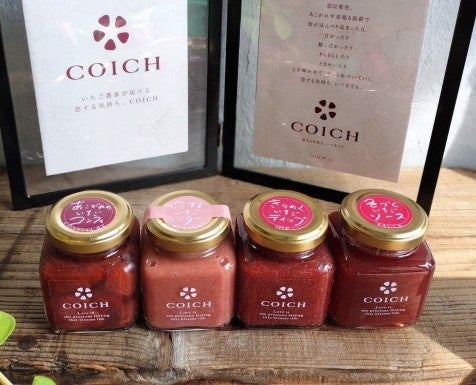 おいしさを追求し、平均糖度15度以上で最高糖度は22度を超えるいちご「ひめこいち」を使用。いちごと発酵バターが絶妙なバランスのいちごバター、コンフィは果肉感たっぷりです。いちごソースは炭酸やお酒で割る楽しみ方も。