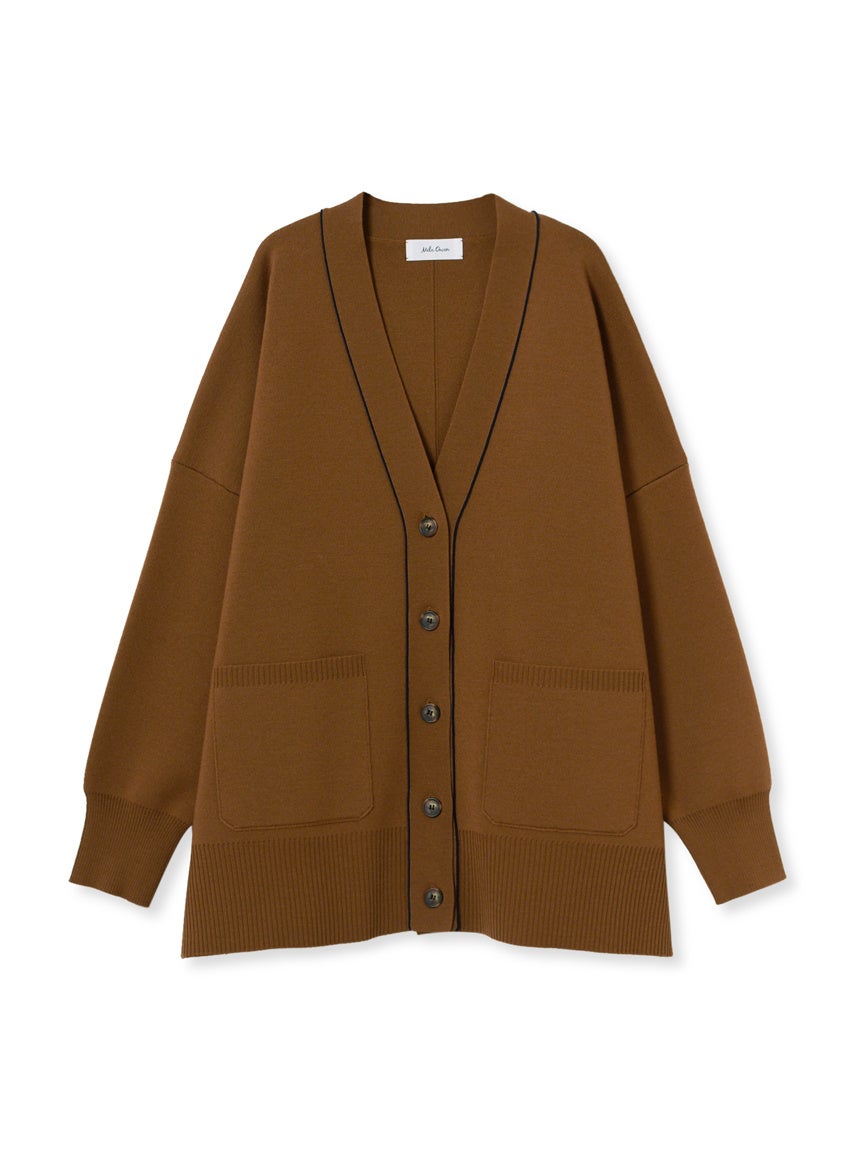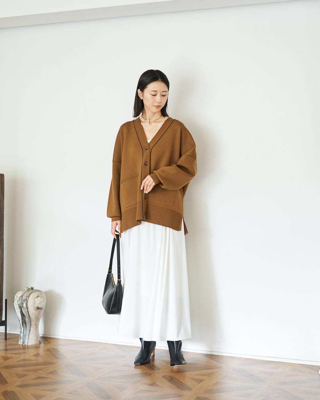 広めの身幅とドロップショルダーが、ベーシックなデザインながらこなれた印象になるカーディガン。