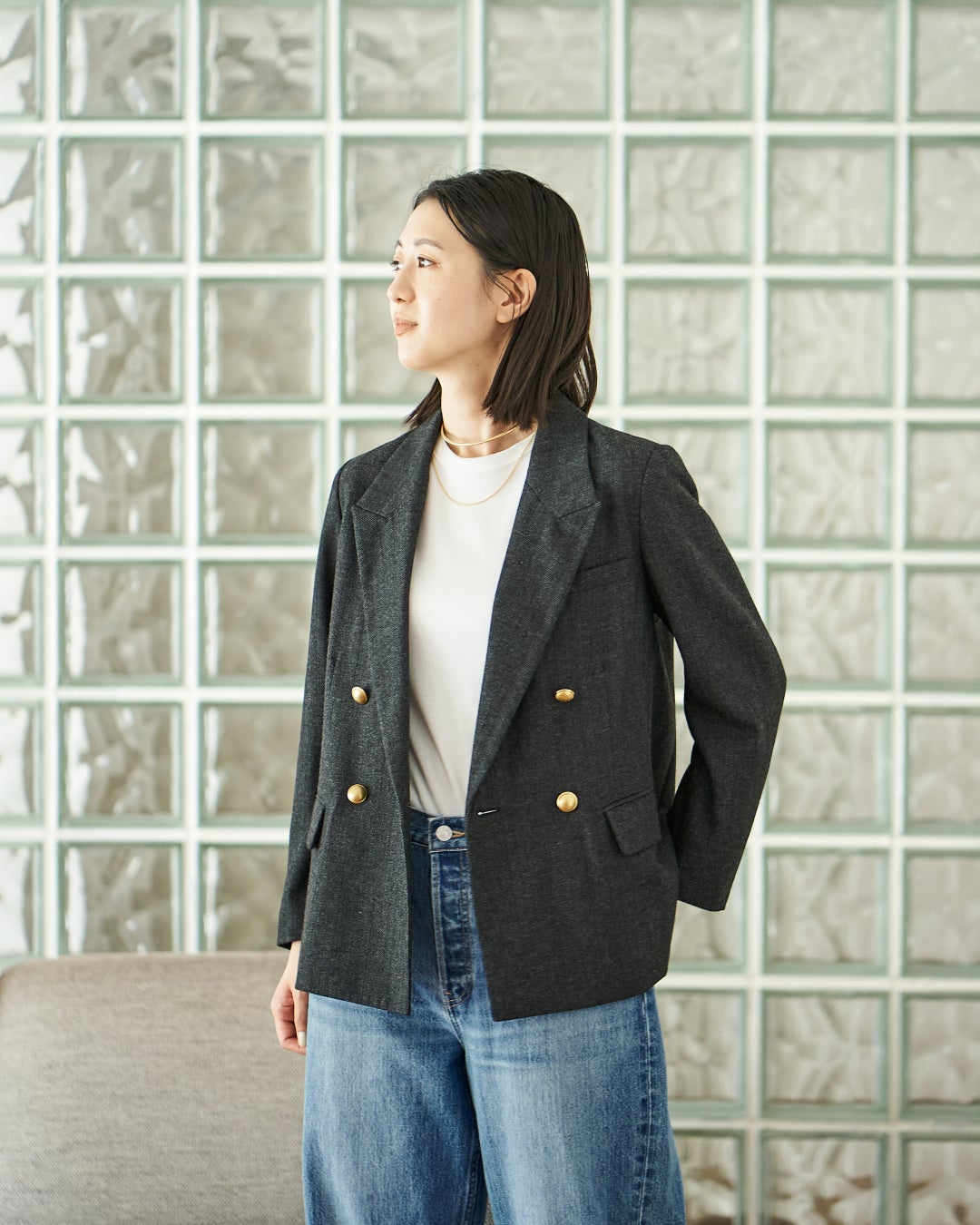 ブランド定番のブレザーをベースに、マニッシュムード漂うヘリンボーン素材で仕上げた秋気分を高めるジャケット。衿裏のカラークロス仕様や内ポケットなど、本格的なブレザーの仕立てを施した一枚です。