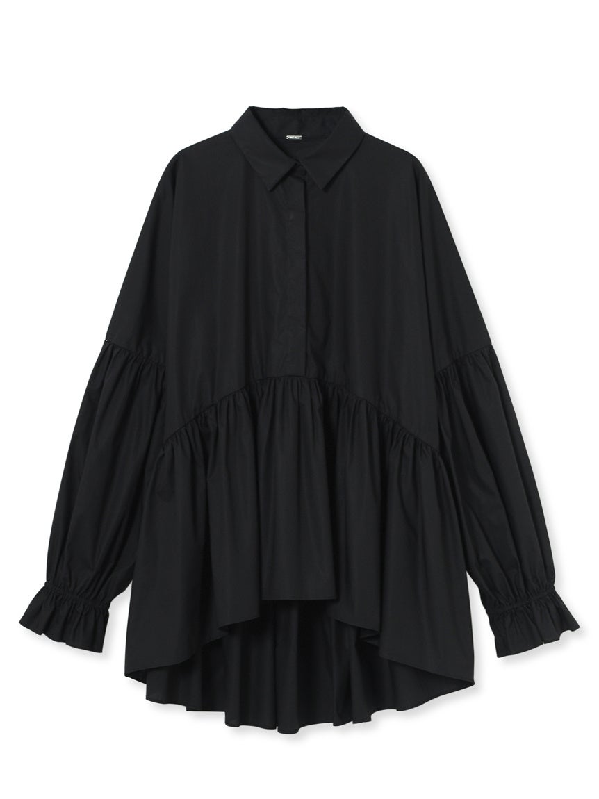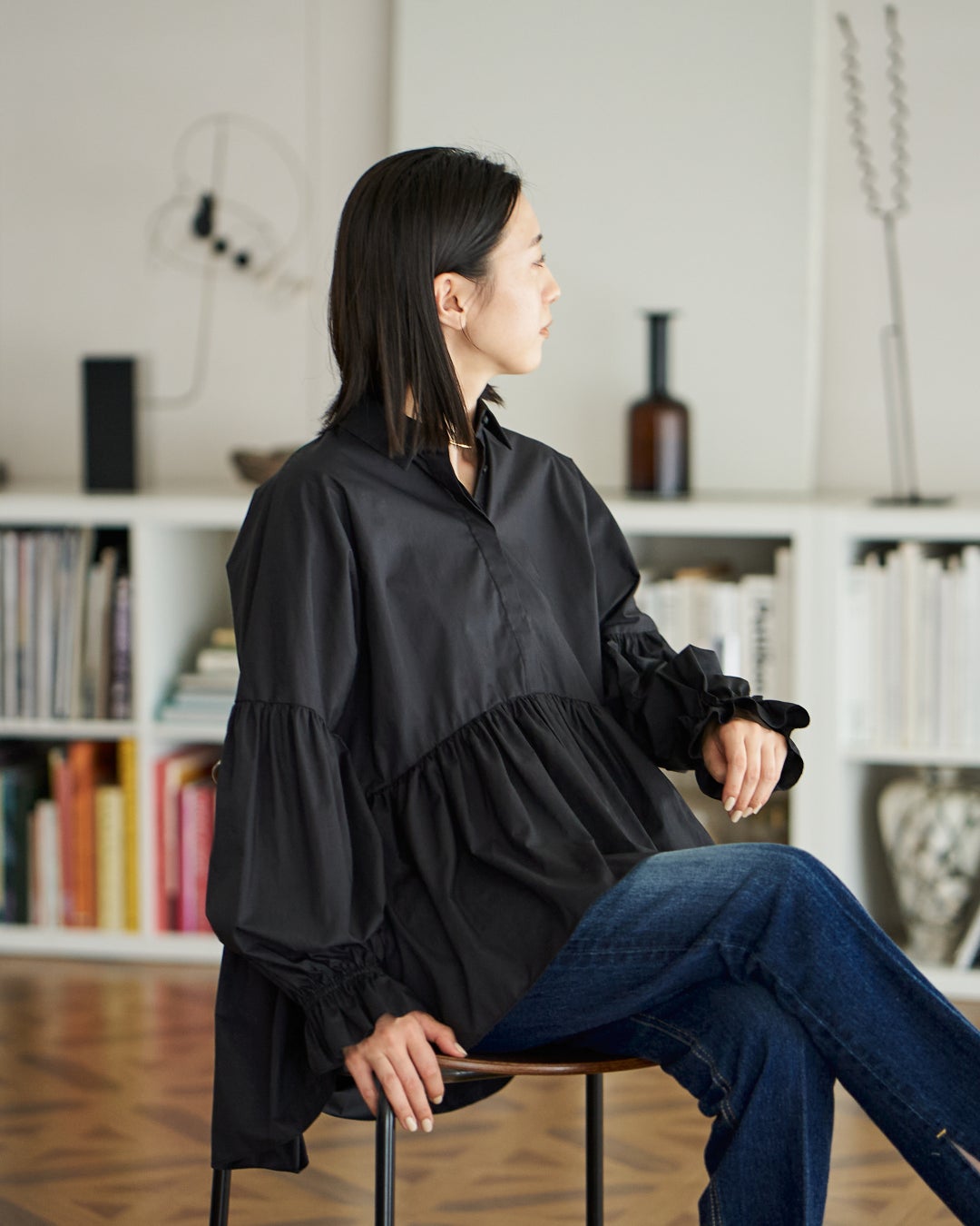 ローウエストで切り替えられたフレアな裾とスリーブデザインが一枚で様になる主役ブラウス。