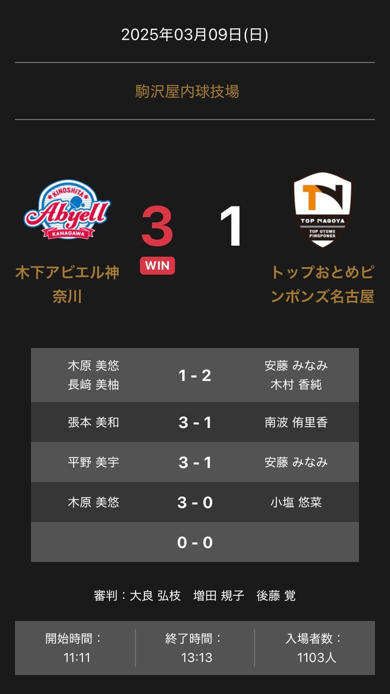 ノジマTリーグ 2024-2025シーズン 公式戦 3月9日開催 「木下アビエル神奈川 vs トップおとめピンポンズ名古屋」の試合は、3-1で木下アビエル神奈川が勝利しました。