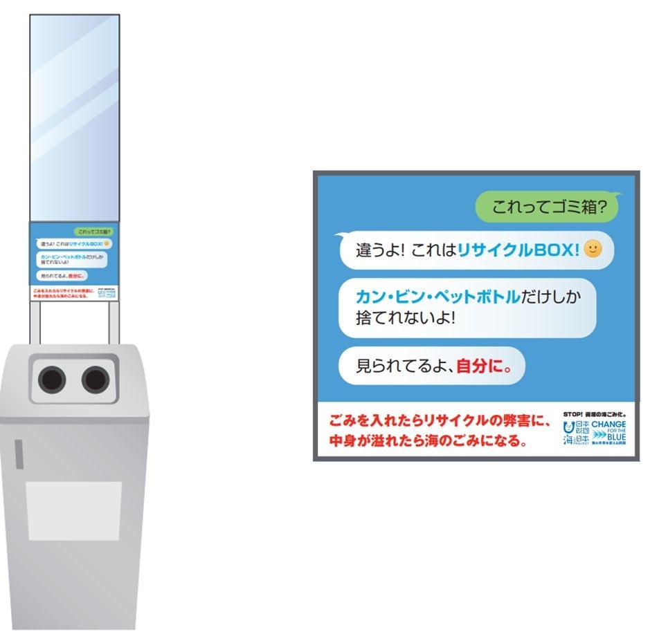 リサイクルBOXにごみを捨てようとする人に対して「誰かが見ている」というメッセージを伝えることで、異物混入減を目指します。
