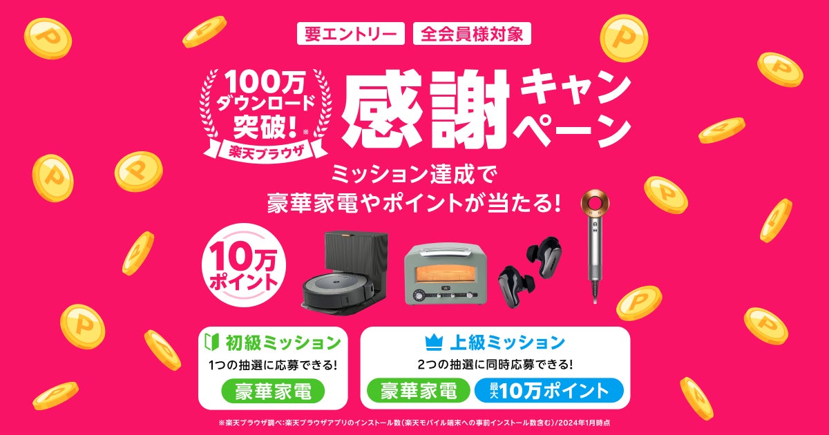 ・内容: キャンペーン期間中にキャンペーンページにて楽天IDでログインのうえエントリーし、「楽天ブラウザ」アプリ内のポイントミッションを達成した方を対象に、合計1,005名に抽選で最大10万ポイントの「楽天ポイント」や、「ルンバ i5+」、「Dyson Supersonic Shine ヘアドライヤー」などの家電を進呈