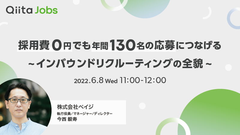 株式会社エイチームのグループ会社であるQiita株式会社(本社:名古屋市中村区、代表取締役社長:柴田健介)は、無料オンラインセミナー「採用費0円でも年間130名の応募に繋げる〜インバウンドリクルーティングの全貌〜」を2022年6月8日(水)に開催します。