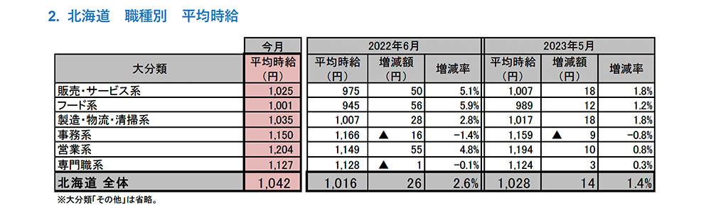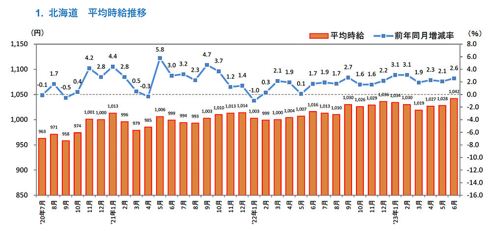 [北海道版]2023年6月度 アルバイト・パート募集時平均時給調査 北海道の6月度平均時給は前年同月より26円増加の1,042円