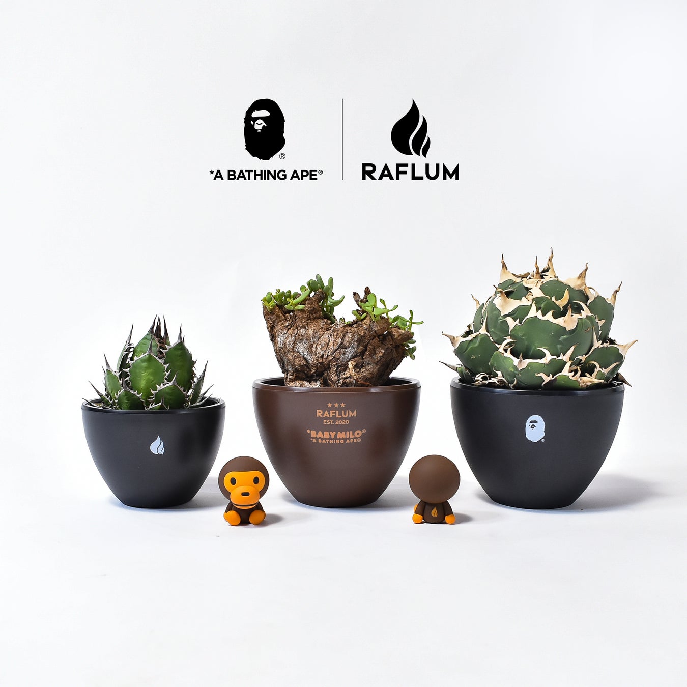 今年25周年を迎えたベイビーマイロを記念して、世界の珍奇植物や塊根植物、アガベなどを専門に取り扱うRAFLUMがコラボレーション。「RAFLUM」大阪店限定のLimited Edition。 11月13日(水)から「A BATHING APE®」 とのコラボレーションによるエコポットを販売します。